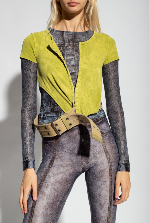 Green ‘T-HOLDHOOK’ top from Diesel. Crafted from a ribbed cotton knit with a tie-dye motif, this style features a round neck, short sleeves, hook & eye closures and a distinctive buckle belt appliqué.