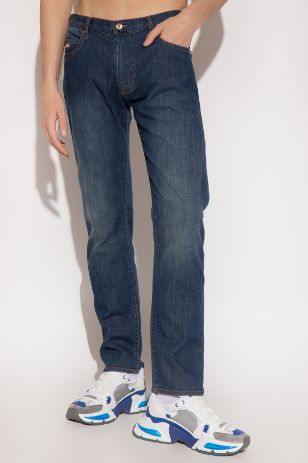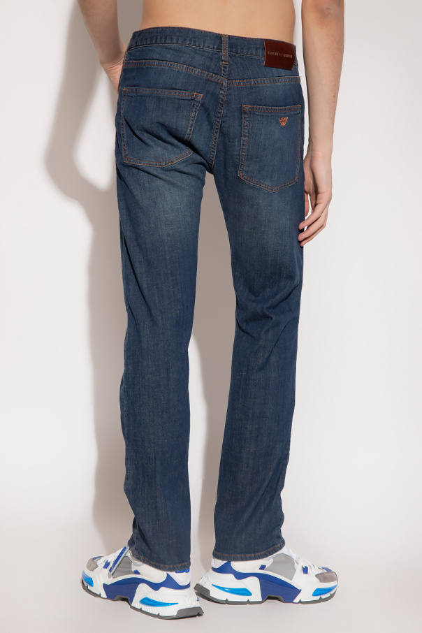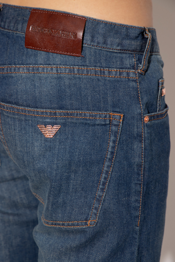 Blue jeans from Emporio Armani. Falling with slightly tapered legs, this pair features a zip fly with a button, classic five pockets and a rose gold-tone logo application at the back.