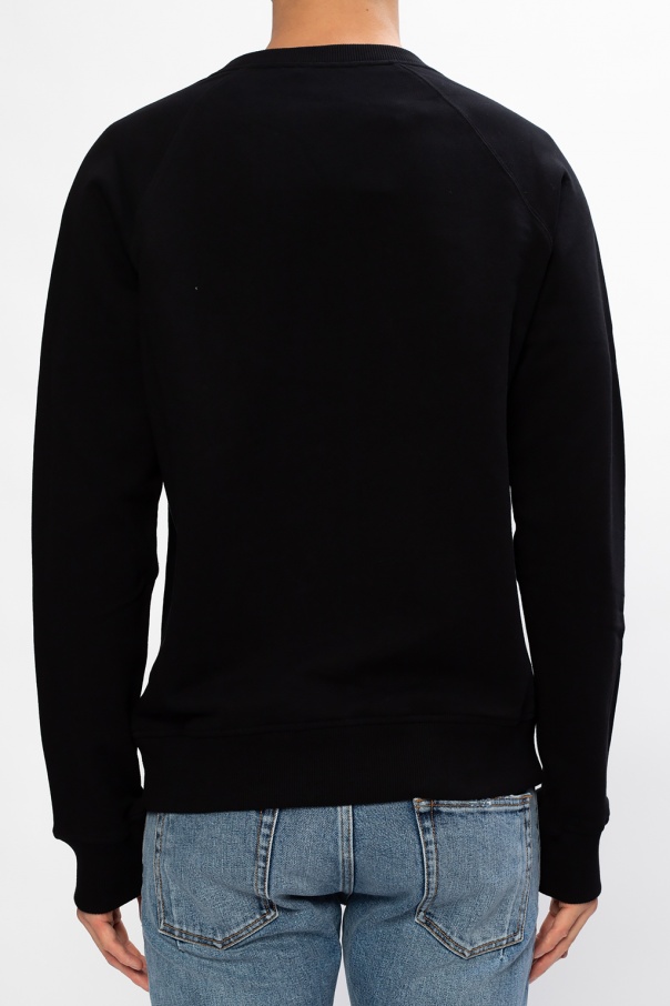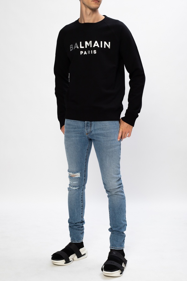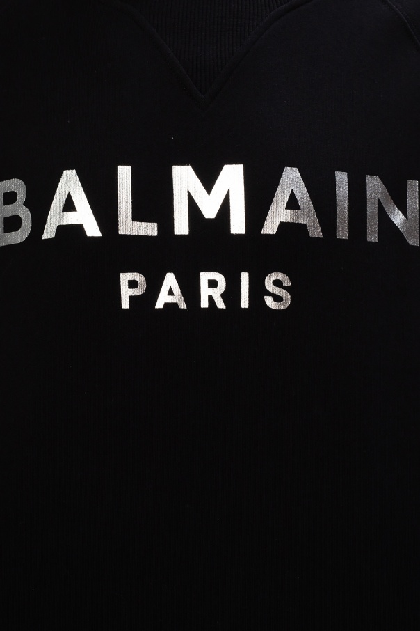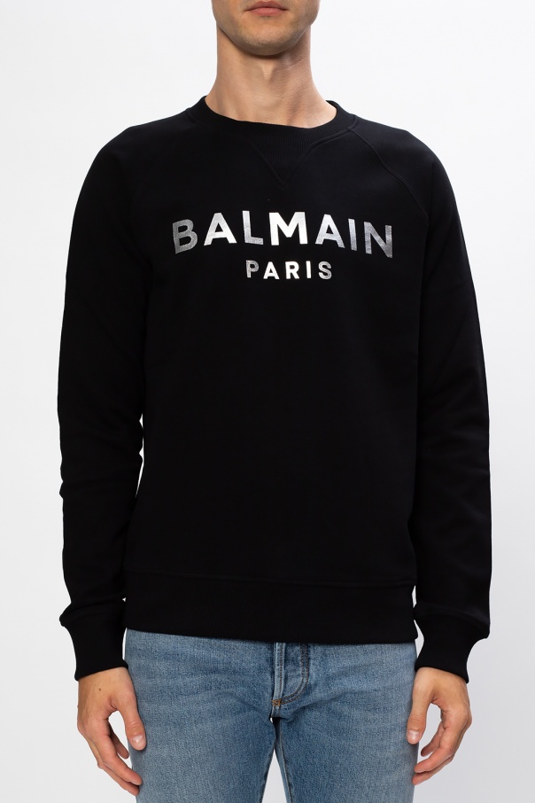 Black crewneck sweatshirt from Balmain. Crafted from cotton, this item comes enriched with a silver-tone logo print and ribbed trims.