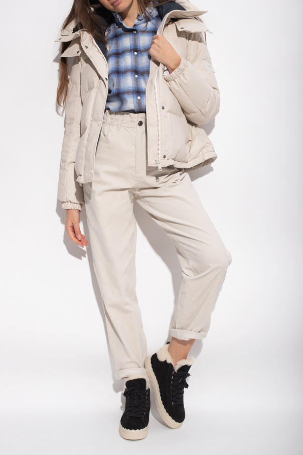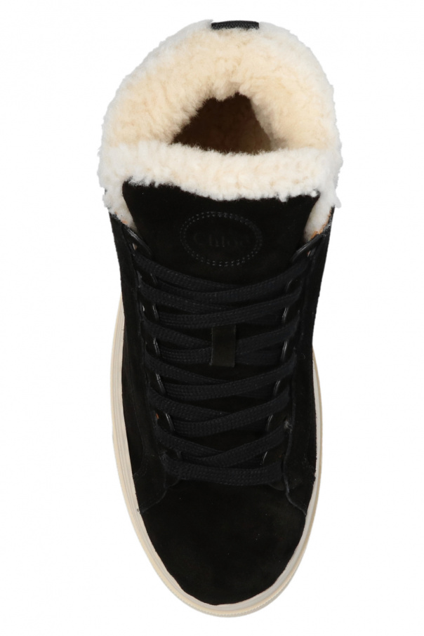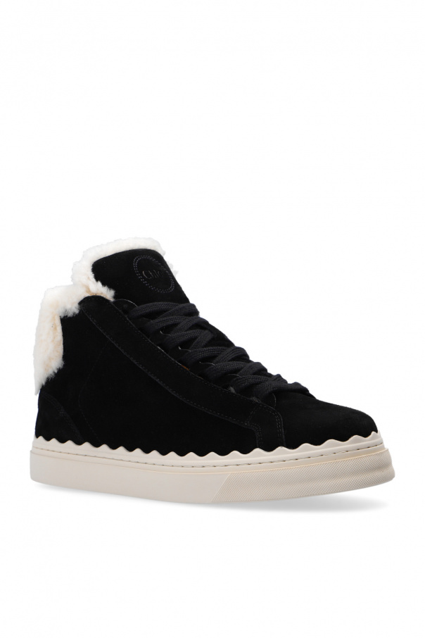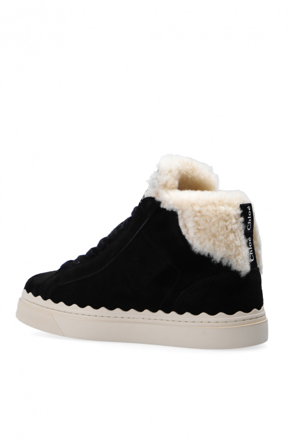 Black ‘Lauren’ sneakers from Chloé. Crafted from suede, this lace-up model sits on a cream rubber sole and showcases cream lamb fur trims, an embossed logo and a white logo print.