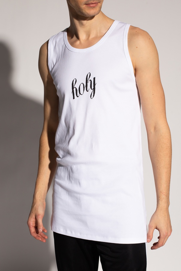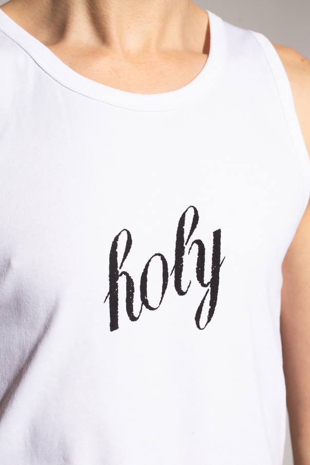 White sleeveless crewneck T-shirt from Ann Demeulemeester. Made of cotton, this garment is decorated with a black print.