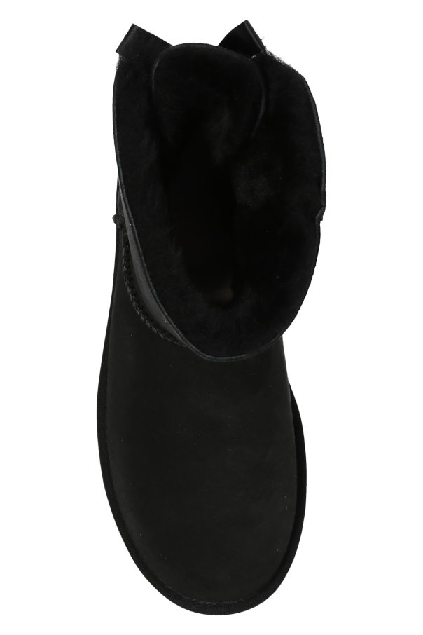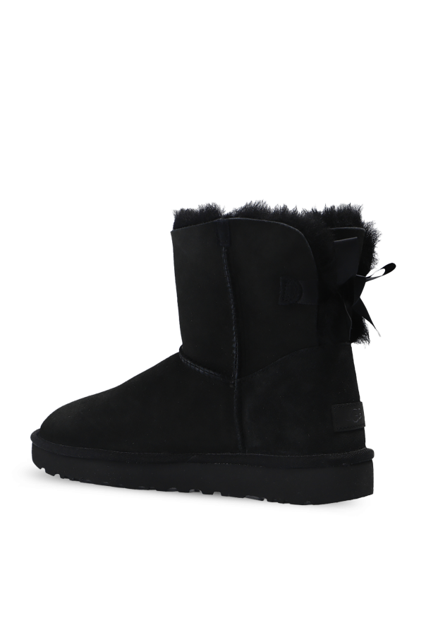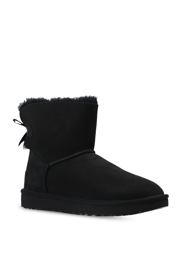 Black 'Mini Bailey Bow II' snow boots from UGG. Crafted from suede, this pair is set on a lightweight and flexible black sole in EVA foam and features sheepskin lining, distinctive stitching details and bow as well as logo patch on the heel for the brand recognition.