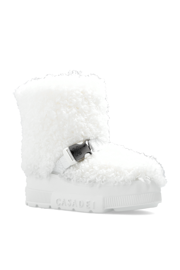 Cream platform boots from Casadei. Made of leather with faux fur trims, this pair sits on a white rubber sole and features a buckle strap.