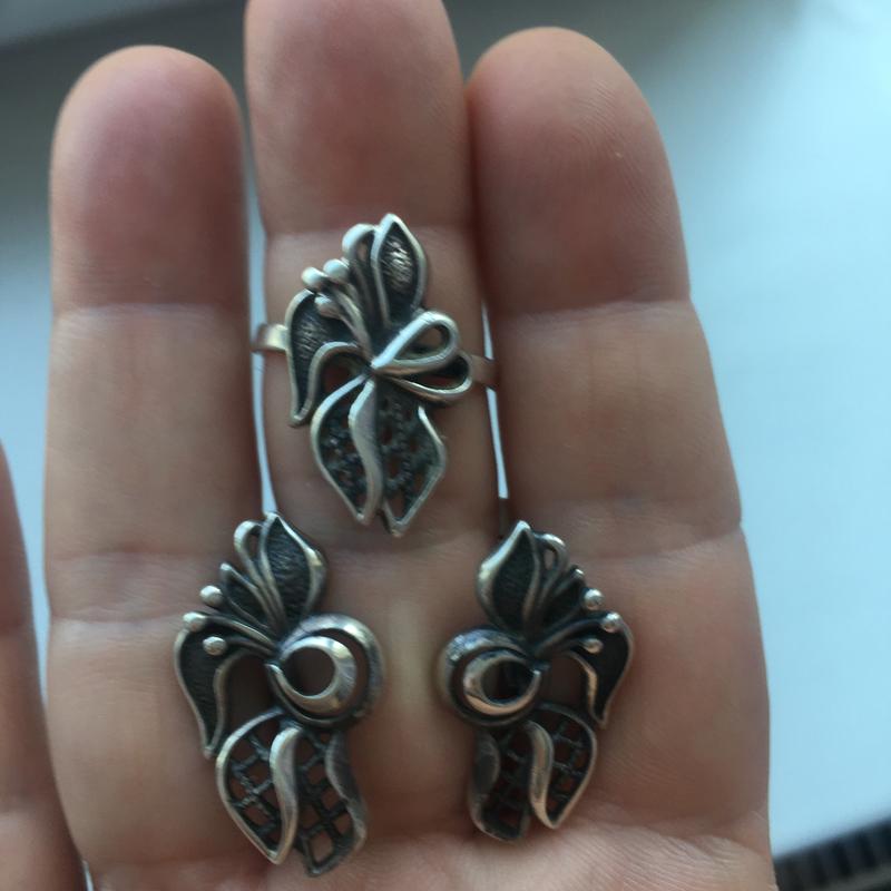 Серебряный набор 925 пробы - серьги и кольцо. кольцо размер 19. Производство Киевские ювелиры. С чернением. Без камней.