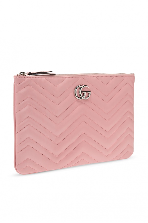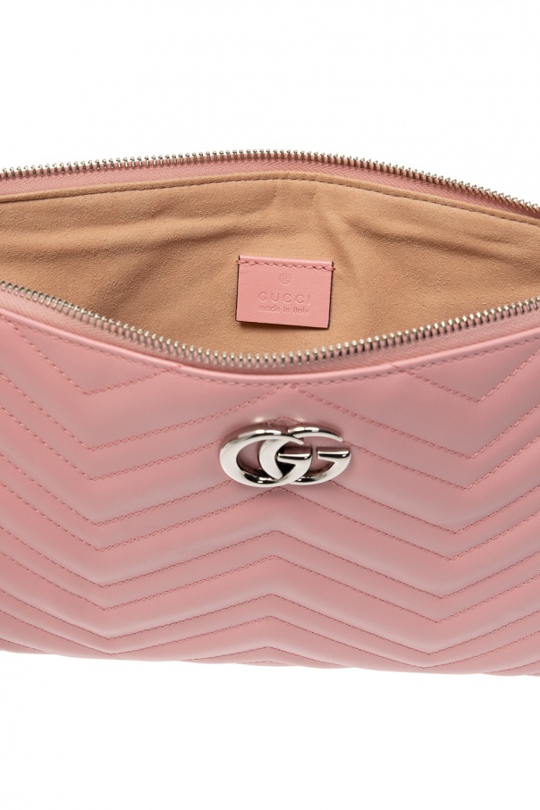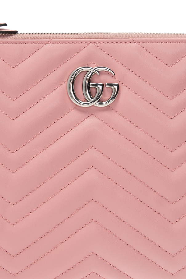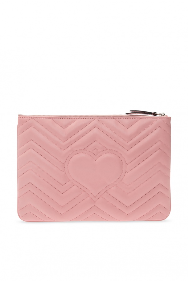 Pink ‘GG Marmont’ quilted clutch from Gucci. Fastened with a zip, this style is complete with a logo appliqué in antiqued silver-tone metal, an embroidered heart motif, beige lining and one internal compartment.