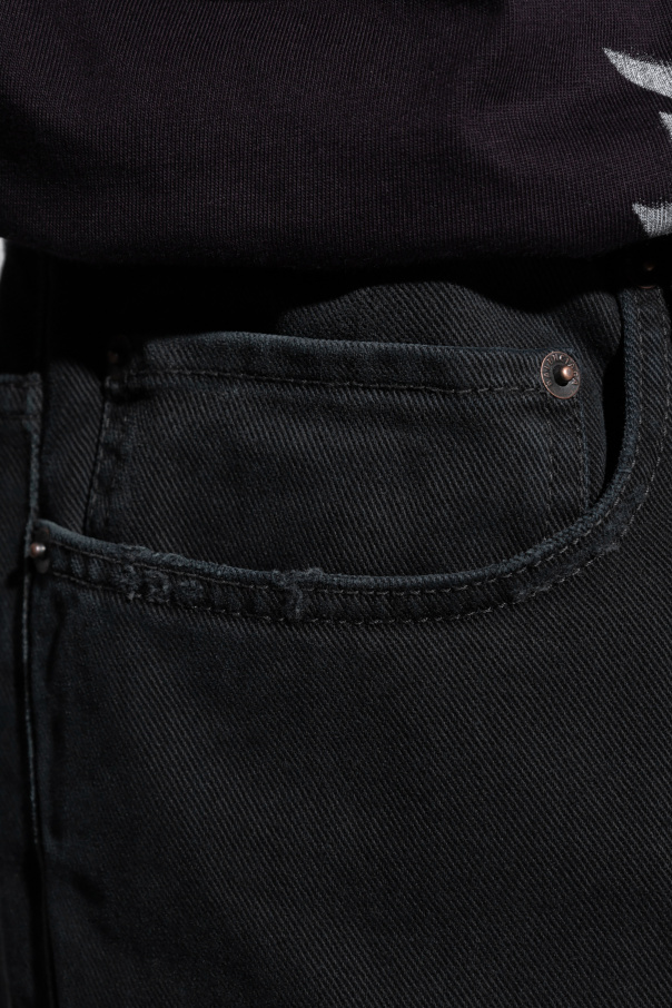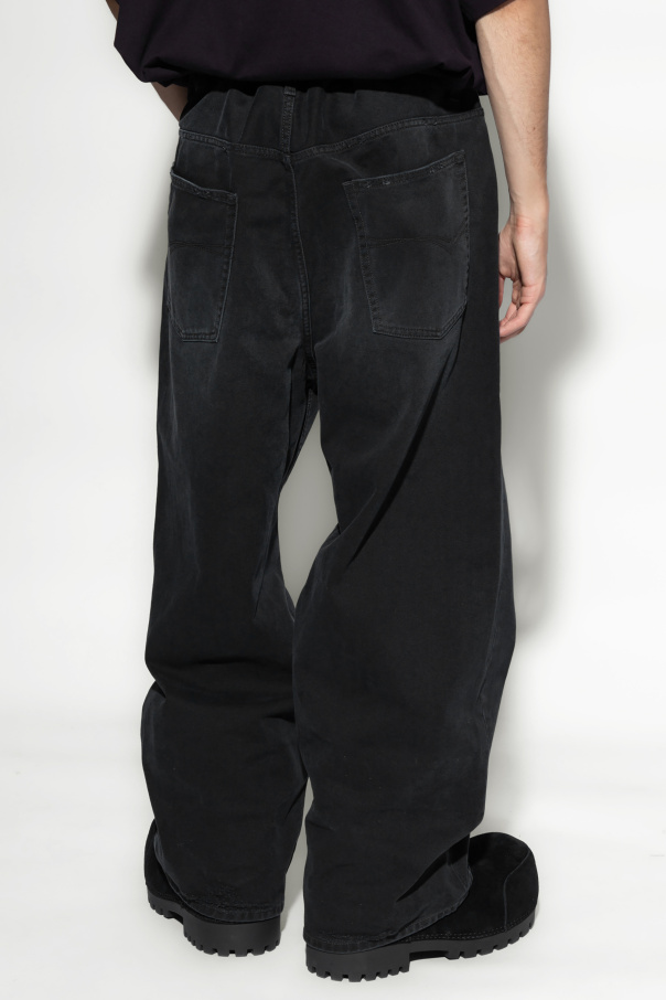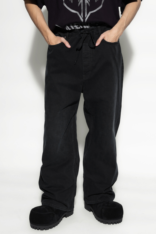 Introducing the epitome of modern elegance and comfort: Balenciaga's Wide-Leg Jeans. Crafted from premium 100% cotton denim, these jeans merge timeless style with contemporary design. The dominant black hue and subtle vintage effect exude sophistication, making them a versatile addition to any wardrobe. The jeans feature a relaxed, wide-leg cut that tapers slightly towards the hem, offering a flattering silhouette that speaks to a free-spirited sense of style. The use of classic denim material ensures durability while providing a soft, comfortable fit. An innovative touch is added with an elastic waistband, complete with adjustable drawstrings, ensuring an impeccable fit for any body type. The back pockets are adorned with traditional stitching, adding a touch of classic charm to these modern jeans. With no overt branding or logos, the focus remains on the quality and design of the jeans, aligning with Balenciaga's commitment to understated luxury. Why Purchase These Jeans? Expertly crafted from 100% cotton for utmost comfort and durability. Stylish wide-leg design that tapers for a contemporary yet flattering look. Adjustable waistband with drawstrings for a perfect, personalized fit. Timeless black color with a vintage effect, offering versatile styling options. Emanates Balenciaga's signature blend of luxury and minimalistic design.
