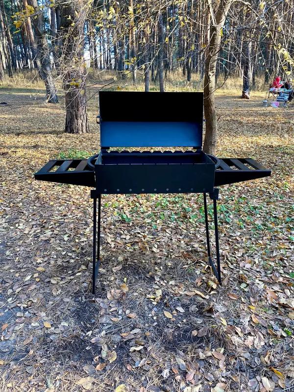 - Жаровня со складными ножками и крышкой барбекю 2 боковые съемные полки-столики