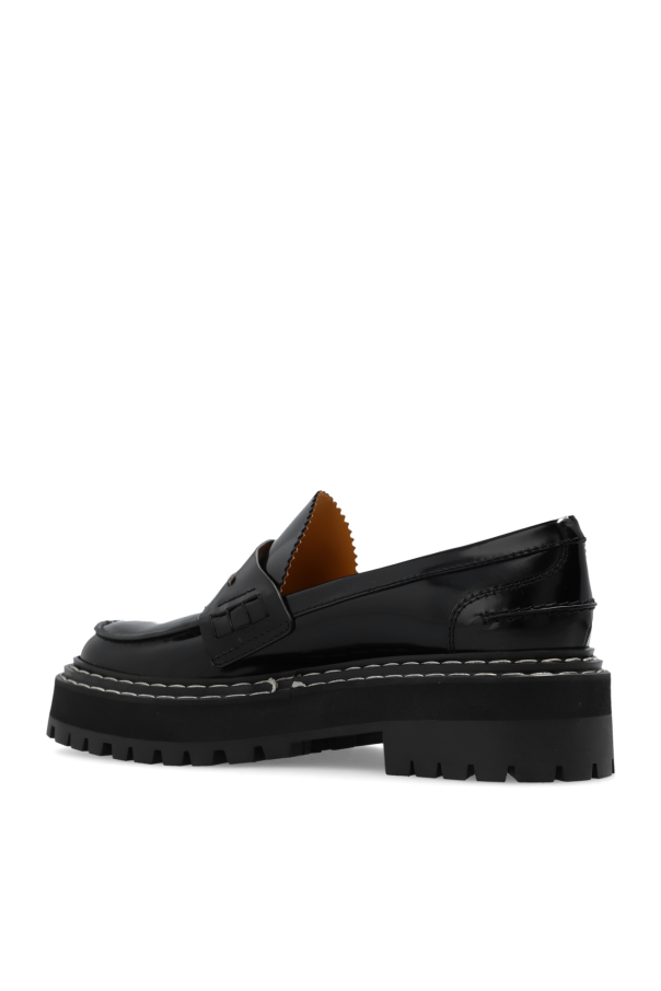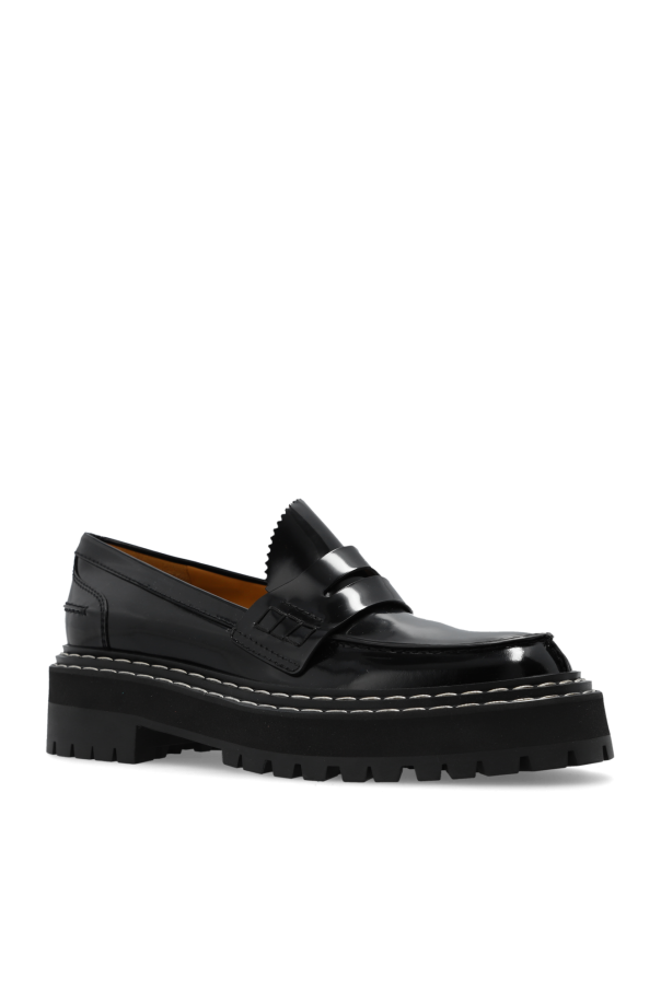 Black loafers from Proenza Schouler. Made of calf leather, this pair features white stitching details and black rubber sole.