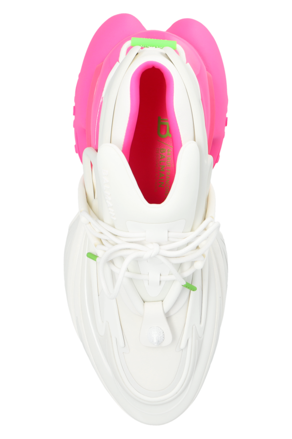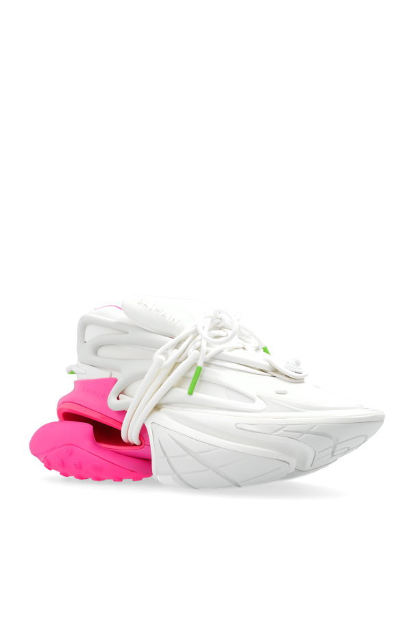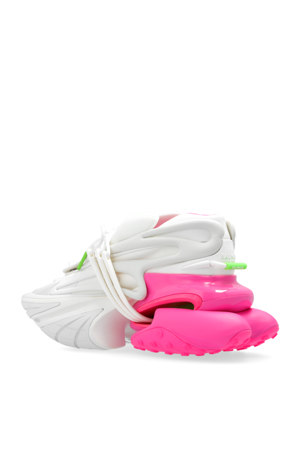 Introducing the ‘Unicorn’ Sport Shoes by Balmain, a harmonious blend of avant-garde aesthetics and unparalleled comfort. Dominated by a pristine white hue with playful pink and subtle green accents, these sneakers epitomize modern chic. Constructed from a luxurious mix of leather, fabric, and rubber, the ‘Unicorn’ features a thick, sculpted pink sole that not only makes a bold statement but also ensures durability and support. The upper part of the shoe is adorned with delicate lines and patterns that lend it a dynamic edge, while the robust white laces promise a secure fit. A unique green loop by the laces adds a touch of whimsy. The interior boasts a soft pink insole with the Balmain logo, suggesting that style does not compromise comfort. The rounded toe and soft, flexible material of the shoe ensure ease of movement, making the ‘Unicorn’ an epitome of both fashion and functionality. Why invest in the ‘Unicorn’ Sport Shoes? Exquisite Design: A modern look with vibrant pink and green accents. Quality Materials: Crafted from premium leather, fabric, and rubber. Comfort & Durability: Thick sculpted sole and flexible upper for all-day wear. Exclusive Detailing: Unique green loop and dynamic patterns for a distinctive style.