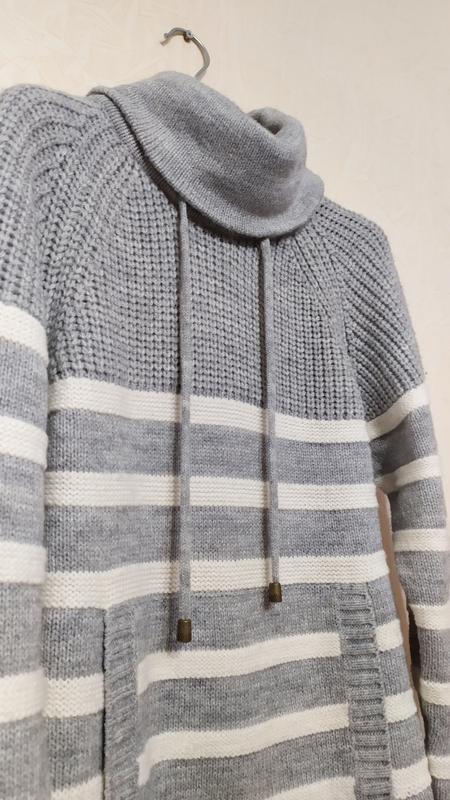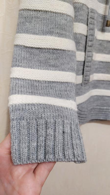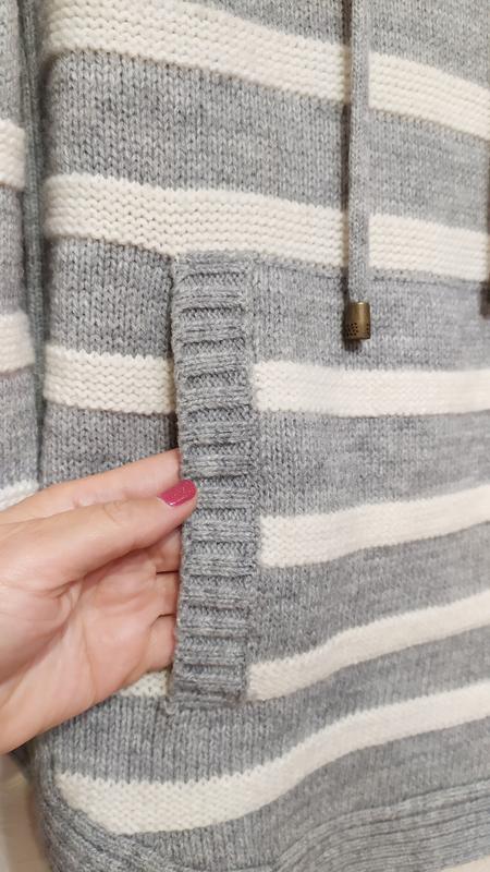 Очень красивый свитер в полоску! Смотрится очень классно! Прекрасное качество ! Тепленький, в составе есть шерсть! На воротнике шнурочек; верх фактурной крупной вязки; спереди карман ; сбоку декоративные деревянные пуговицы. Состояние идеальное, без дефектов. Размер указан М. Длина 65см, рукав от горловины 67см, пог 50см