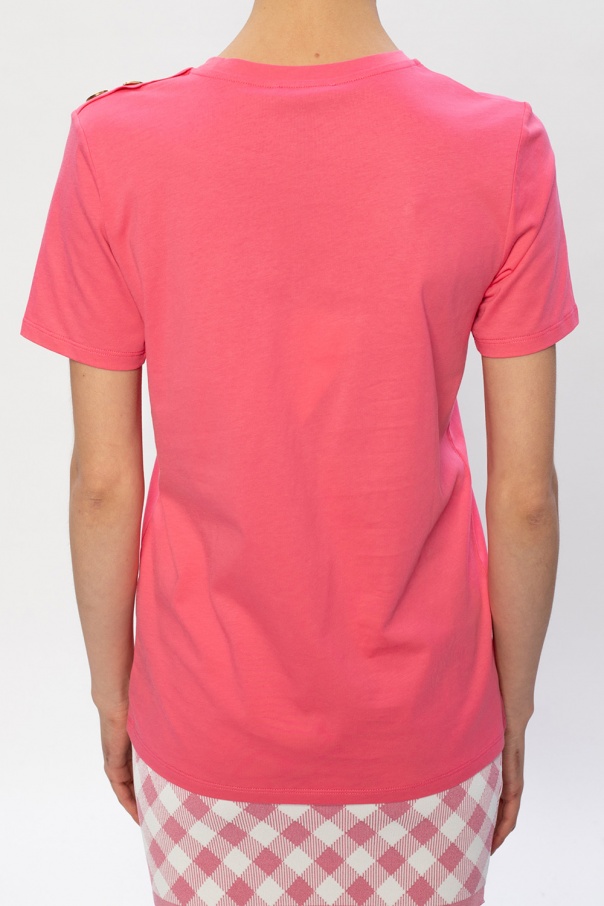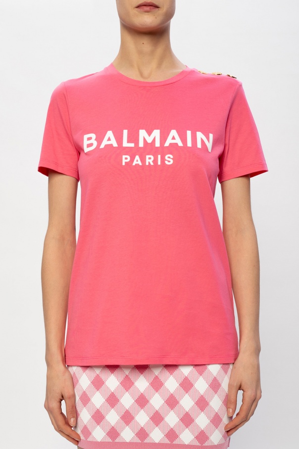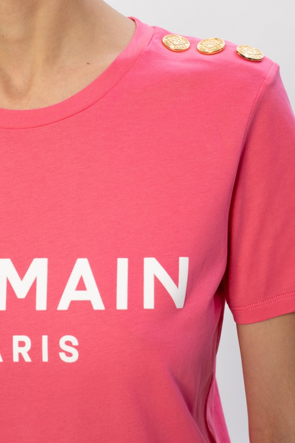 Pink crewneck T-shirt from Balmain. Crafted from cotton, this design is enriched by a white logo print and decorative appliqués in gold-tone.
