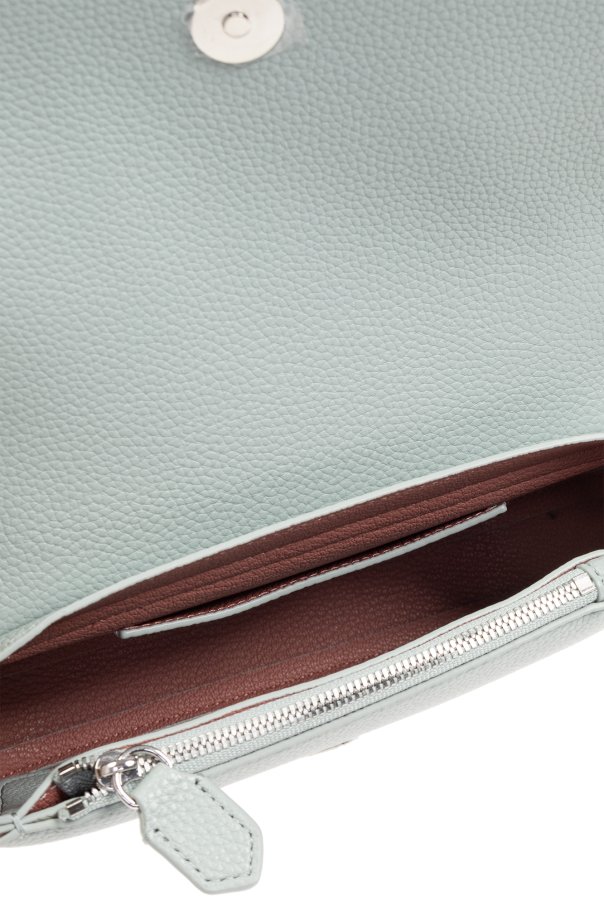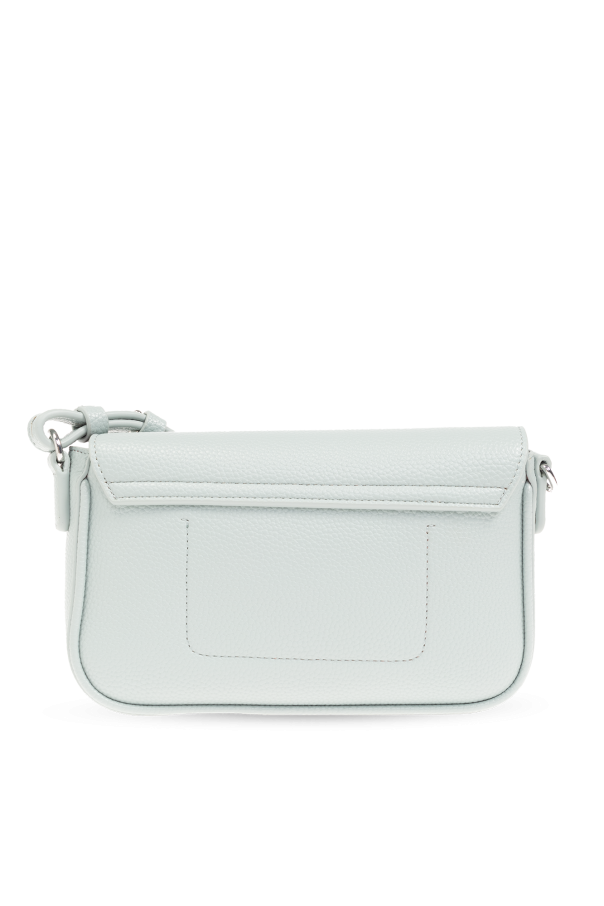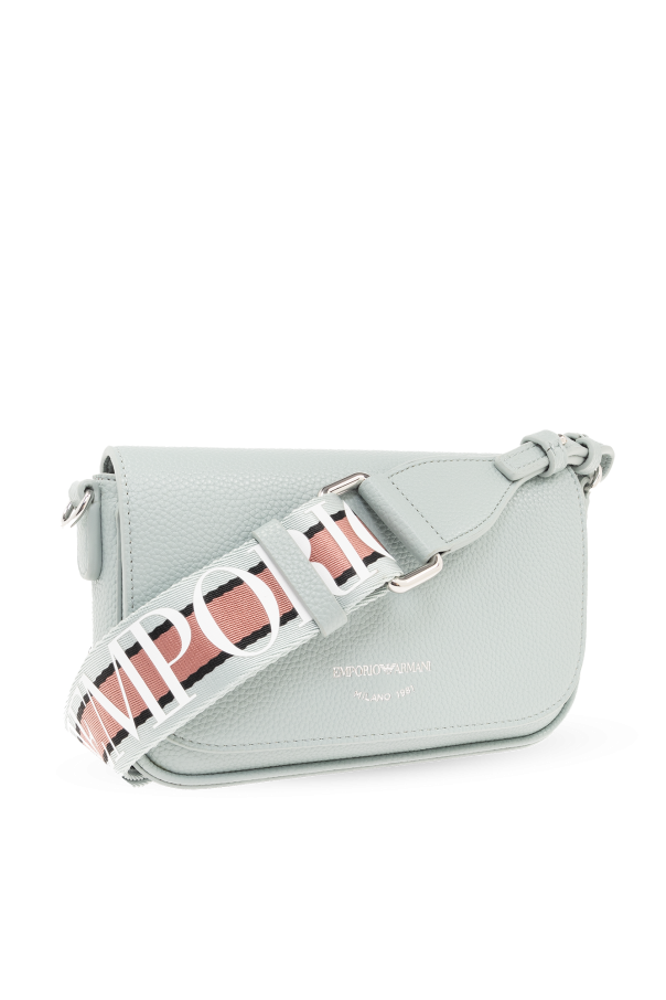 Bluish green shoulder bag from Emporio Armani. Made of grained faux leather, this model features a magnetic snap, silver-tone logo print, detachable and adjustable strap in blue and pink with a logo, silver-tone metal hardware and one internal compartment with one zip pocket and one card slot.