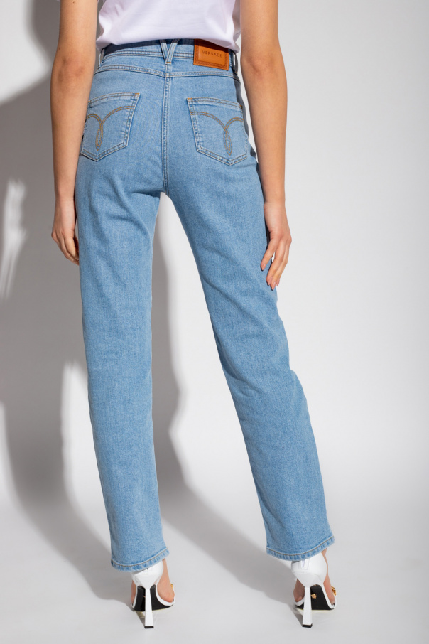 Light blue jeans from Versace. Made of cotton with a straight cut, this pair features a zip fly with a button, classic five pockets and exposed seams and a brown leather patch with an embossed logo at the back.