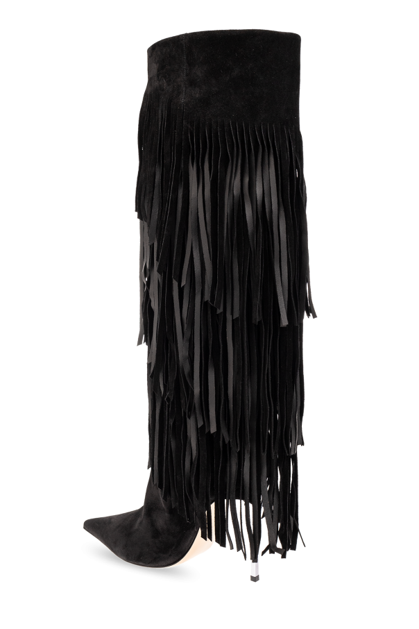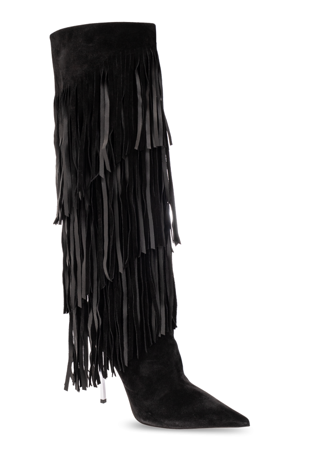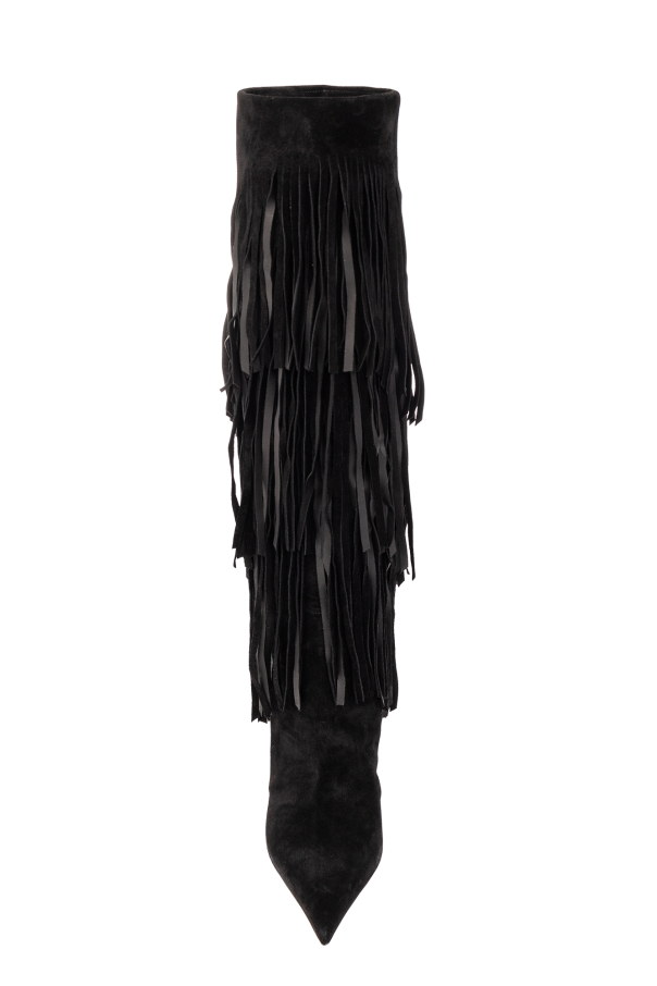 Black ‘Super Blade’ heeled boots from Casadei. Made of suede, this pair sits on a beige leather sole, this pair features fringes and a pointed toe.
