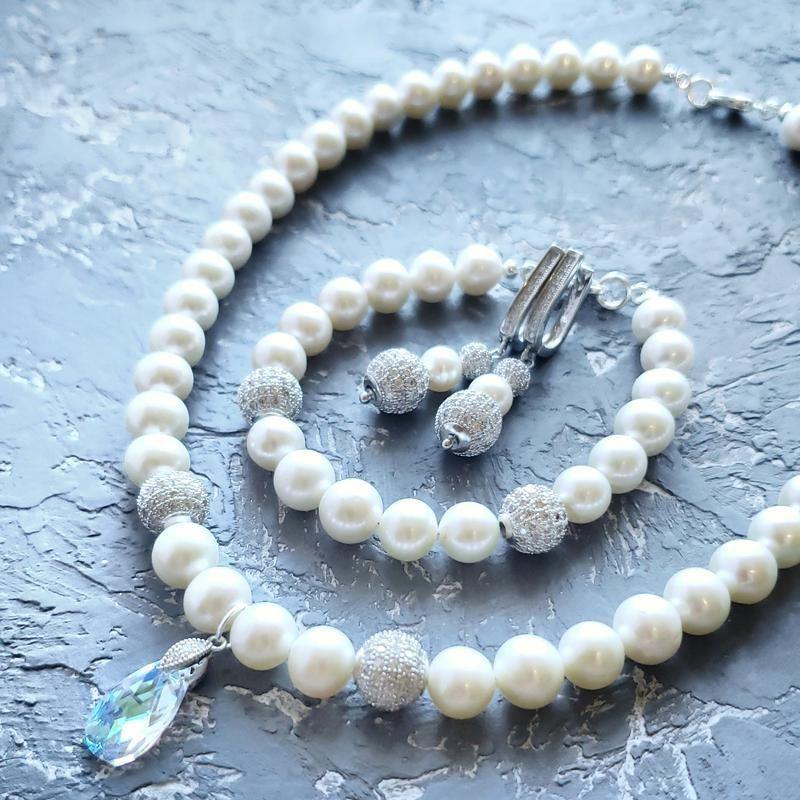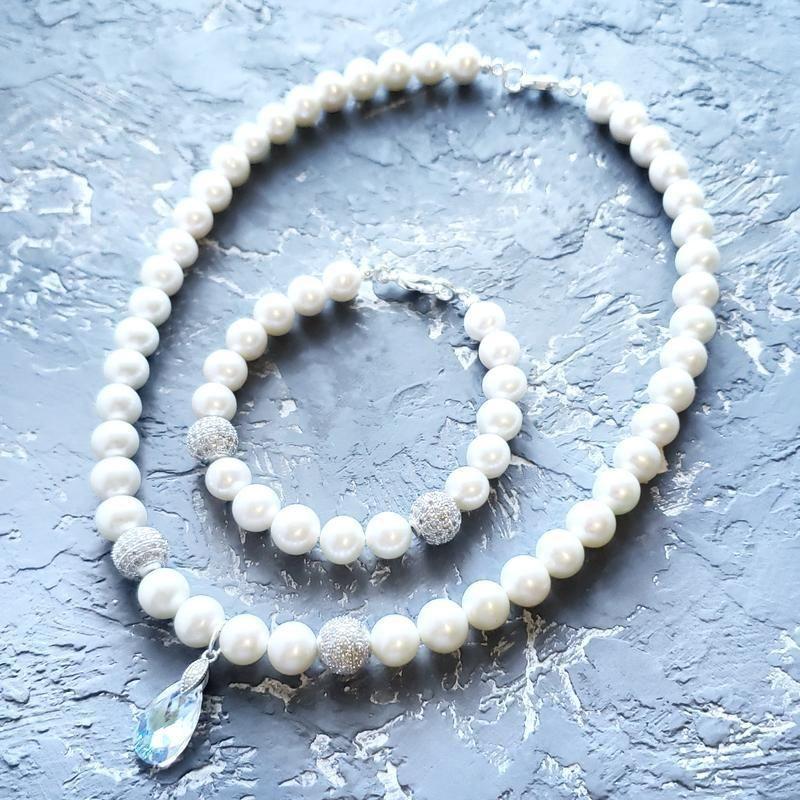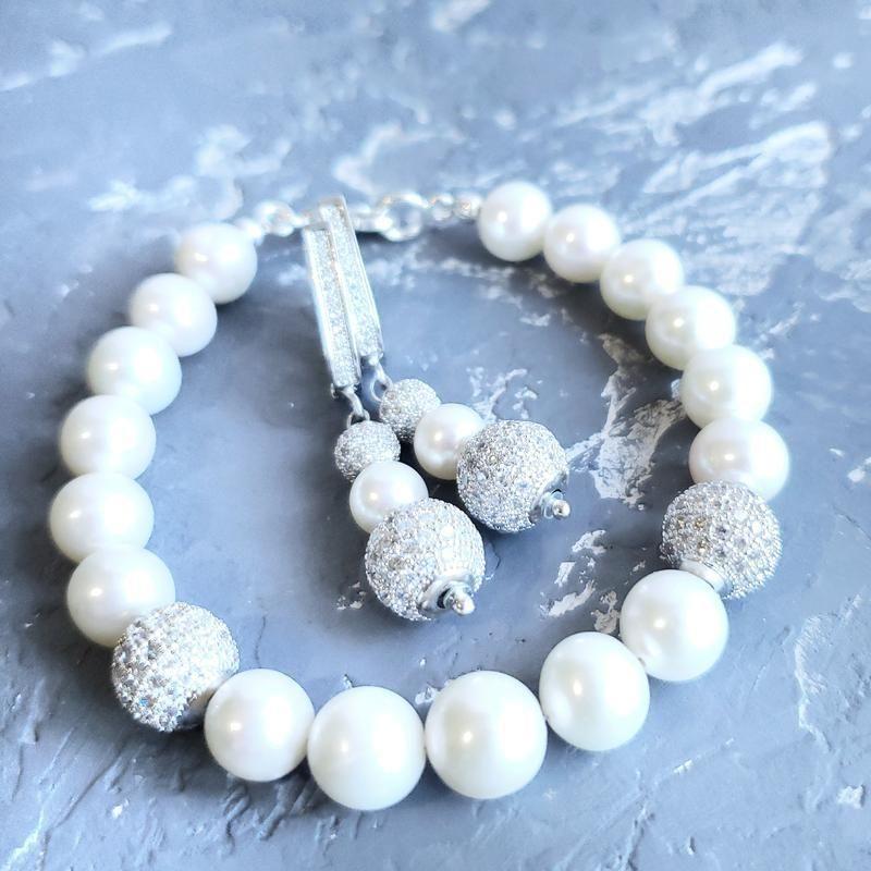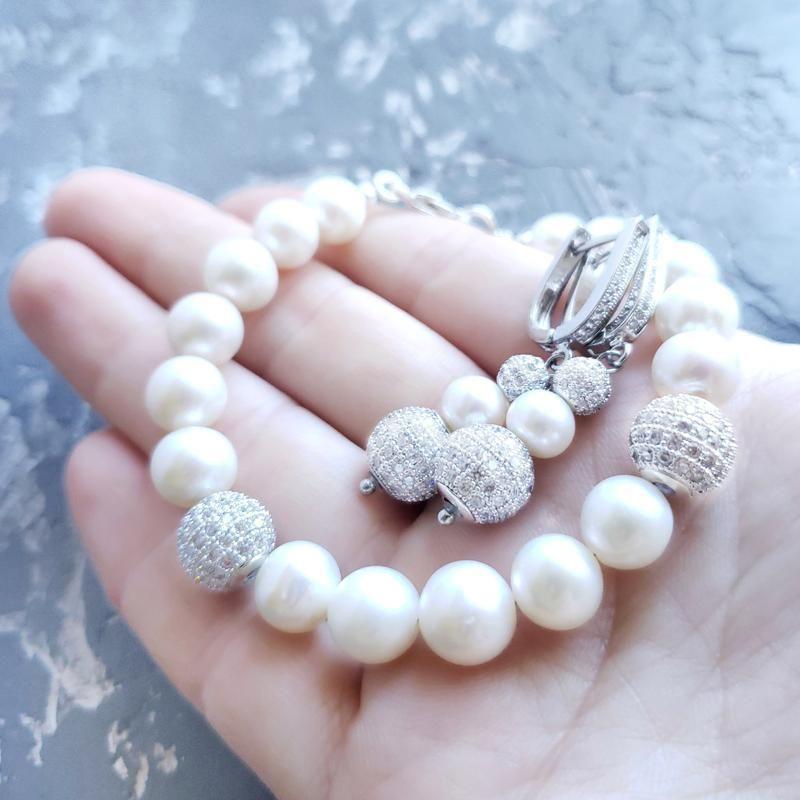 Комплект з натуральних великих білих перлів високого класу і кристалів циркону: браслет та сережки. Браслет і сережки з перлів - чудовий подарунок для мами, подруги, дружини, сестри на день народження, ювілей, весілля чи випускний. Застібки сережок - медичний сплав, інкрустовані кристалами циркону. Довжина браслету - на ваше замовлення. Вартість вказана за комплект, де довжина браслета до 18 см включно (як на фото). Довжина сережок: 45 мм. Застібки сережок - медичний сплав, англійський замок. Розмір перлів у браслеті: 10-9 мм (по центру-крупніші, на кінцях - менші). На последнем фото есть подарочная шкатулка из натурального дерева, что не входит в стоимость, но может быть заказана отдельно.
