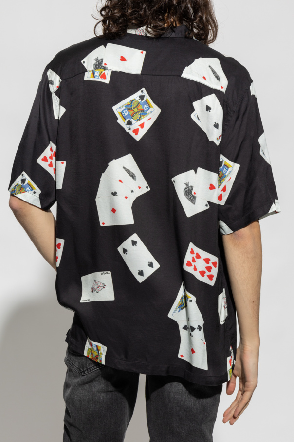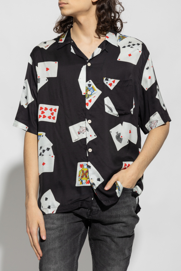 Black ‘Holdem’ shirt from AllSaints. Embellished with a colourful graphic print, this style features short sleeves, button fastenings and side slits.