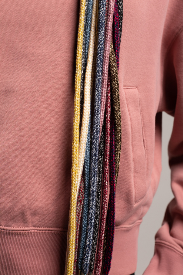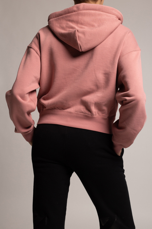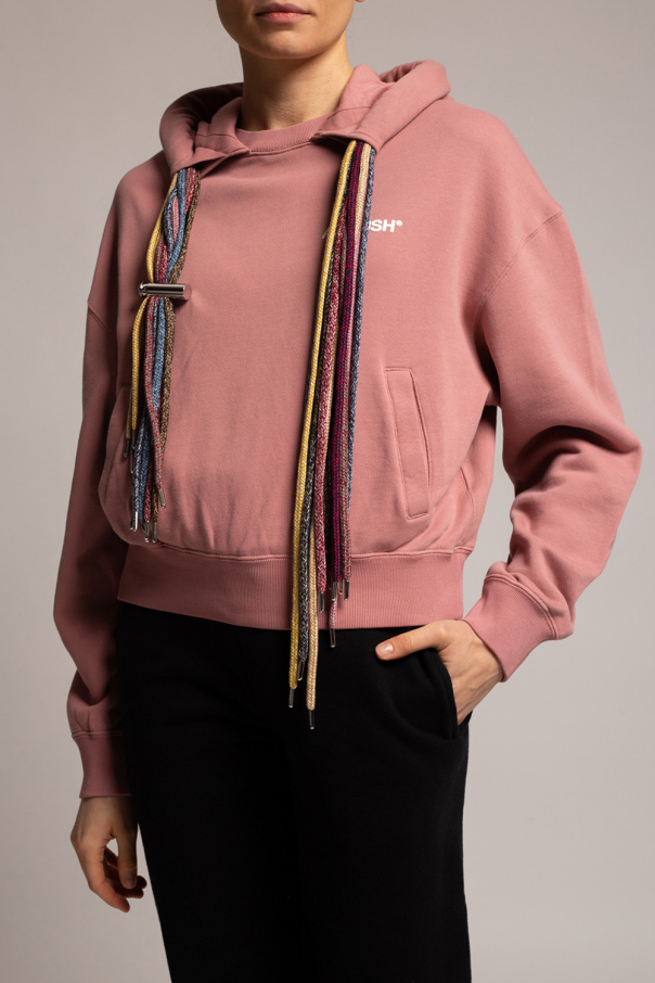 Pink hoodie from Ambush. Crafted from cotton jersey, this style showcases a white graphic print with the brand's logo, a hood cinched with colourful drawstrings, a kangaroo pocket and a ribbed bottom hem and cuffs.
