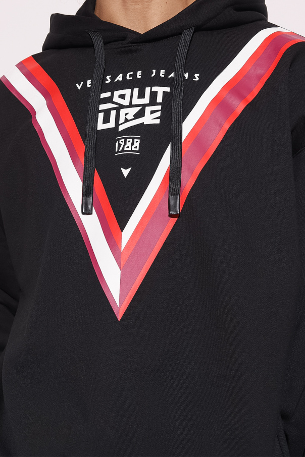 Black hoodie from Versace Jeans Couture. Made of cotton, this garment features a multicolored logo print, drawstring hood and ribbed trims at the hem and cuffs.