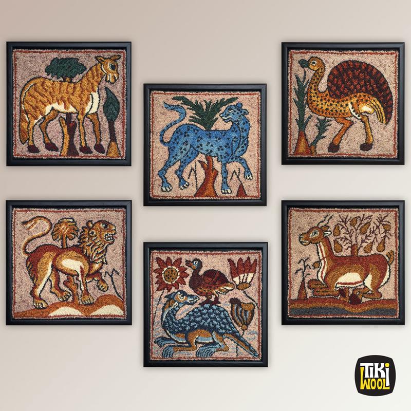 Коллекция содержит 50 панелей, преимущественно животных, богов, богинь, нимф и известных достопримечательностей.Для основы использована ткань 100% лен и пряжа ручной покраски 100% шерсть. Панно с ковровой вышивкой ручной работы обрамлено деревянной рамкой из ясеня. Рамка очень прочная, а черный цвет и фактура древесины подходит к большинству интерьеров.