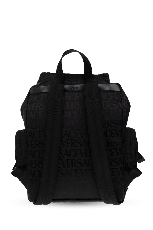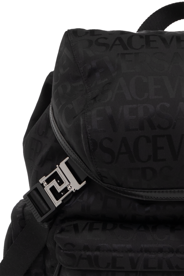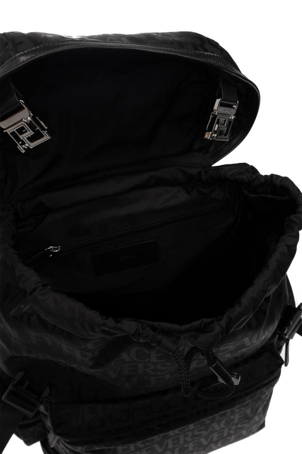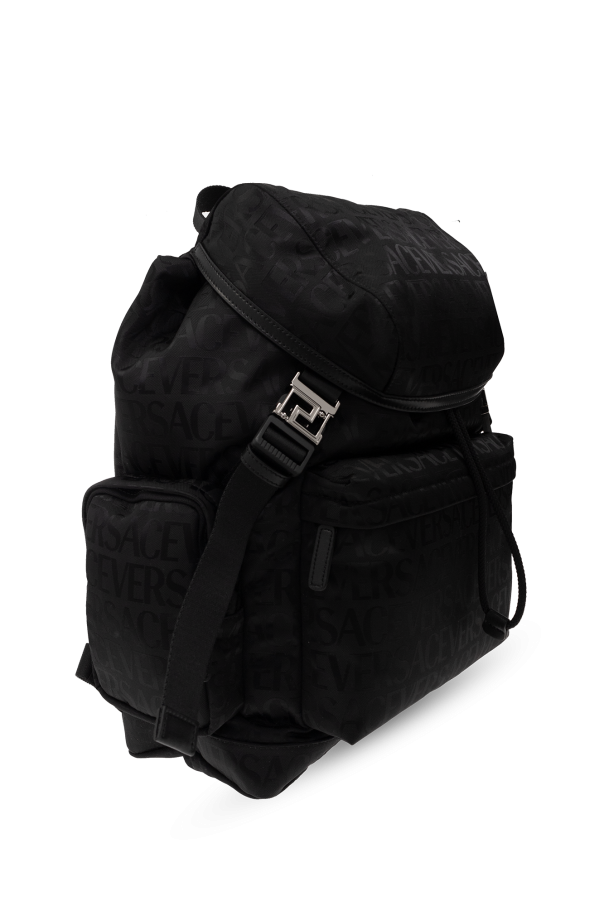 Black backpack from Versace. Made of fabric with a jacquard logo pattern, this model features a flap with straps and Greek motif buckles, zip pockets on the front and sides, top handle, adjustable shoulder strap and one internal compartment with drawstrings and one zip pocket.