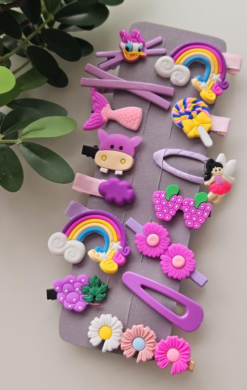 Набор очень ярких заколок для маленькой принцессы. В наборе 14 разных по размеру, но гармоничных друг с другом заколочек.