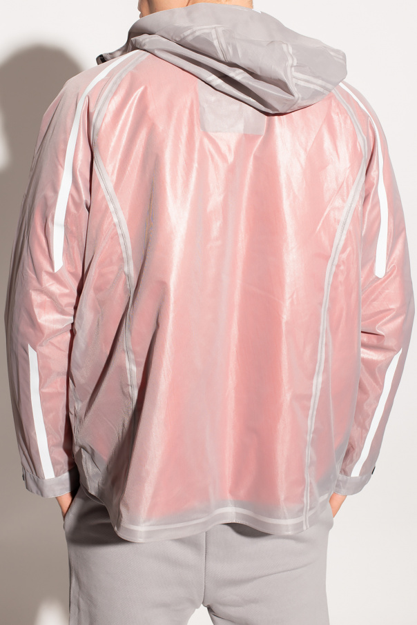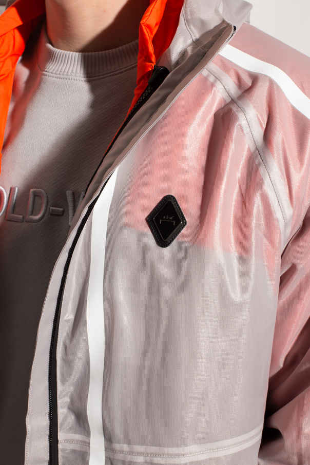 Grey and orange double-layered jacket with a hood from A Cold Wall. Accentuated with printed white stripes and a black and silver-tone raised logo appliqué, this panelled design features zippers and velcro closures, two flapped pockets with snaps, long sleeves with elasticated cuffs and a quilted inner layer detailed with velcro-fastened flap pockets.