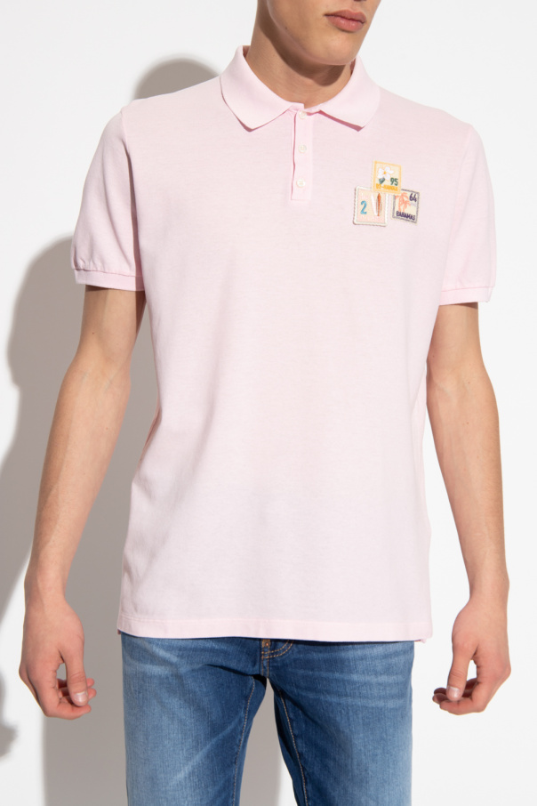 Pink polo shirt from Dsquared2. Made of cotton, this style features a button placket, colourful post stamp patches on the front and short sleeves with elasticated cuffs.