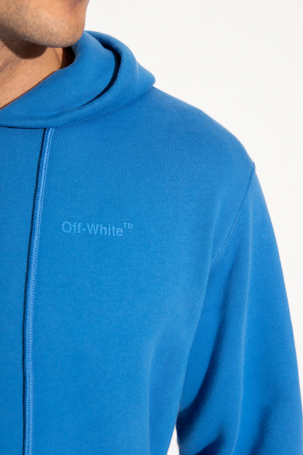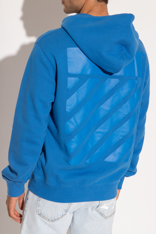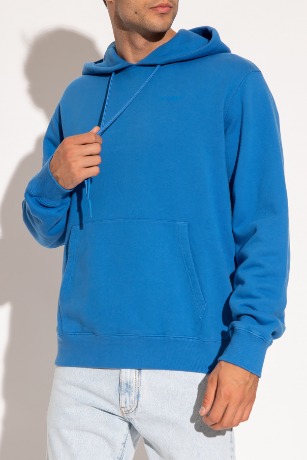 Blue hoodie from Off-White. Made of cotton, this long sleeve design features a logo print, slip pocket, print with the label’s signature diagonal stripes, drawstring hood and ribbed trims at the hem and cuffs.
