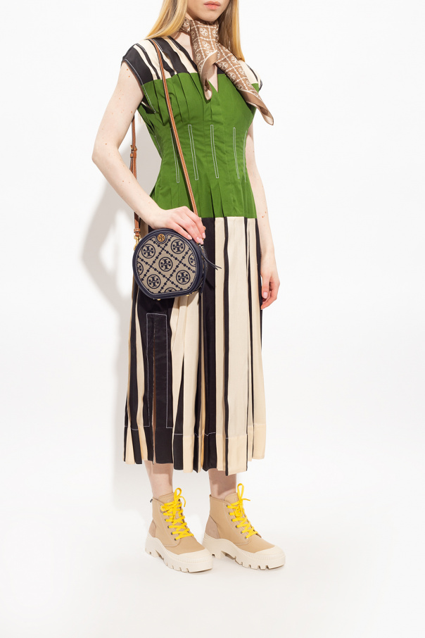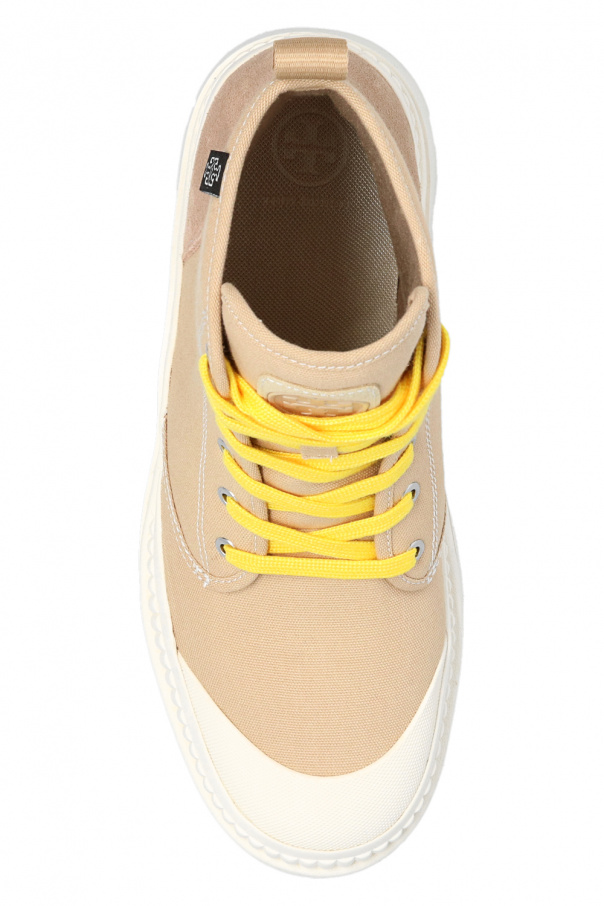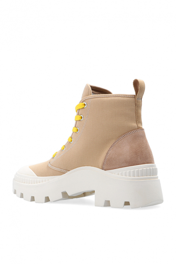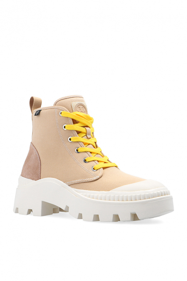 Beige ‘Camp’ ankle boots from Tory Burch. Inspired by military desert boots, this canvas-crafted model features front lace-up fastenings, suede and rubber trims, logo detailing on the tongue and hem, and a chunky sole in cream rubber. Yellow swappable shoelaces with the brand's logo included.