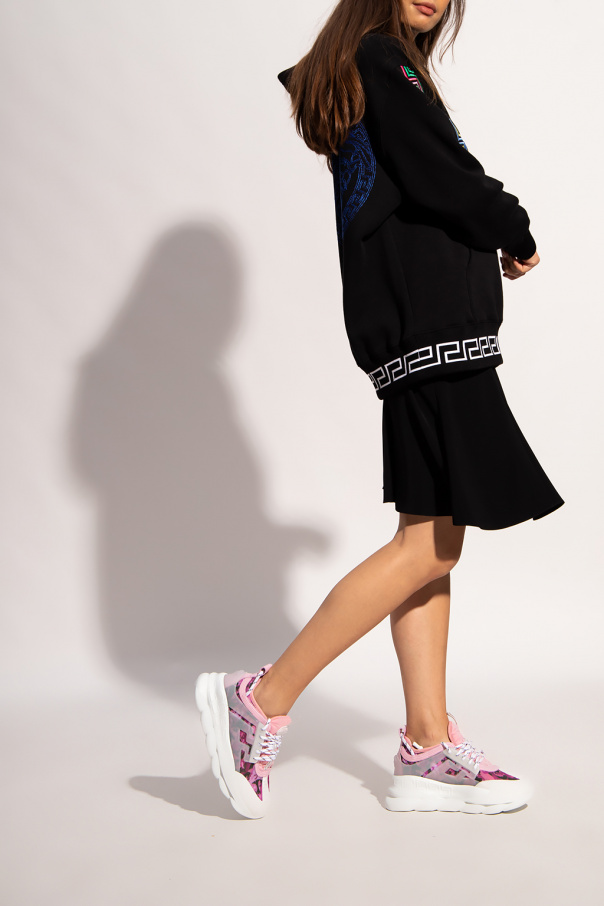 Black sweatshirt with a drawcord-adjustable hood from Versace. Crafted from cotton jersey, this hoodie showcases a colourful print with the brand's logo and graphic embroideries with the brand's signature motif of Medusa and Greek and Barocco patterns.
