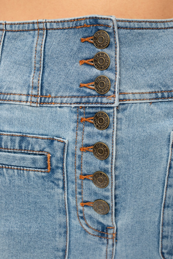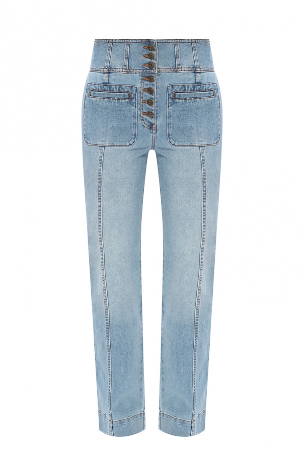 Blue ‘Mars’ high-waisted jeans from Ulla Johnson. Fastened with buttons, this straight leg design features orange stitching details, two front pockets and two back pockets.