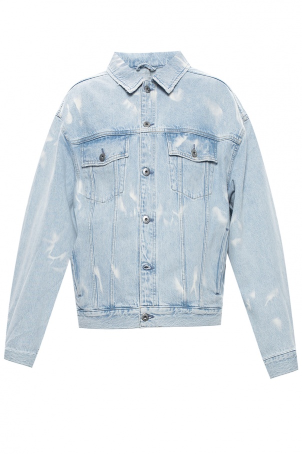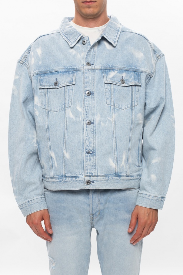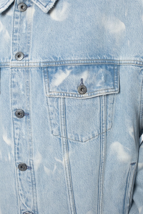 Light blue ‘Denby’ distressed denim jacket from AllSaints. This casual design features button fastenings, two flap pockets with buttons and two slip pockets.