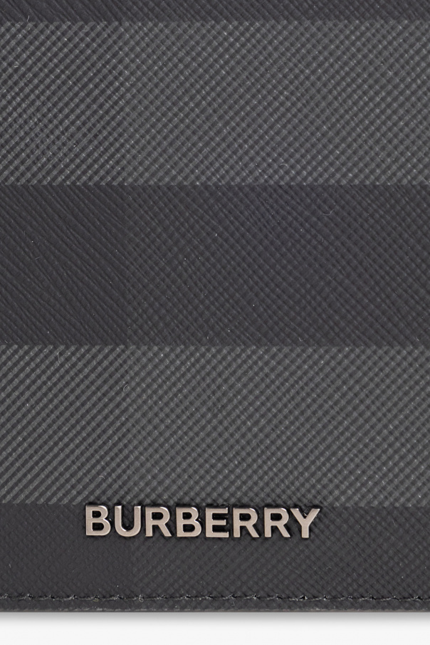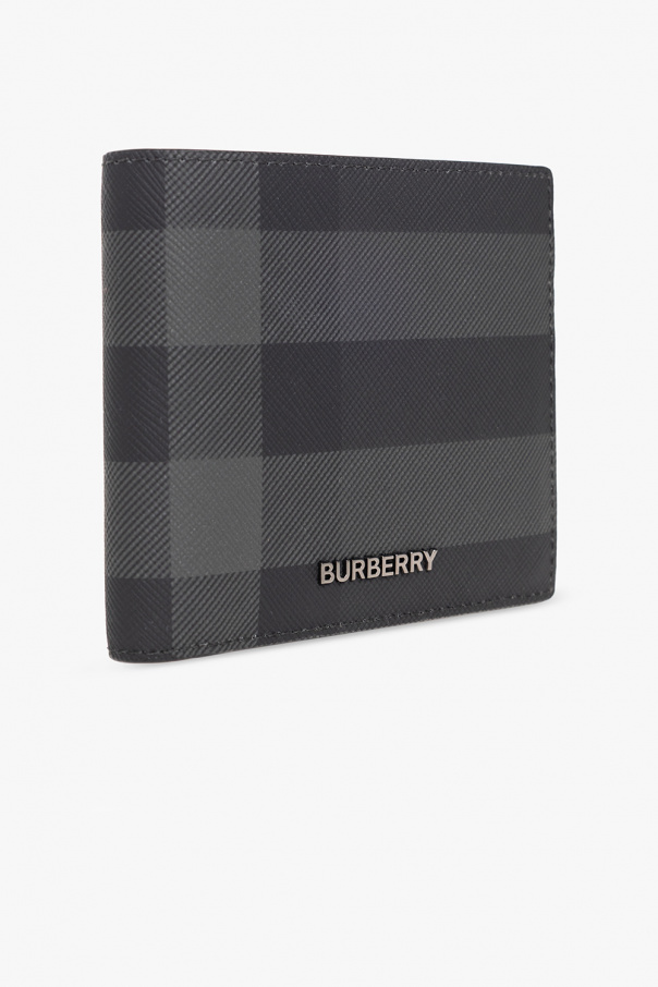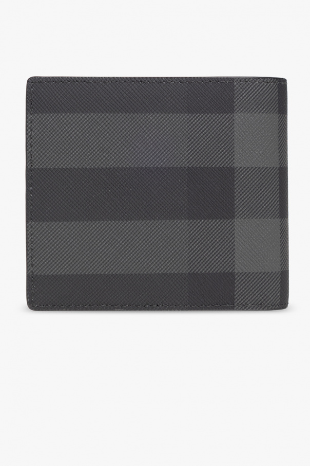 Grey and black bifold wallet from Burberry. Crafted from canvas with a check pattern, this item is decorated with a metal logo and has two bill compartments, two slip pockets and eight card slots inside.
