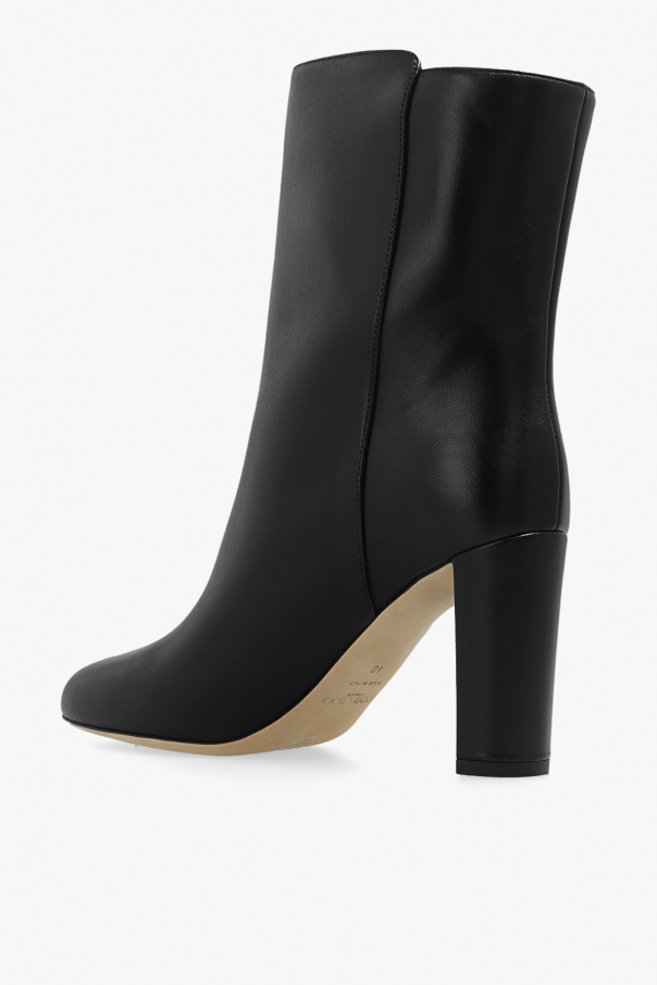 Black ‘Rina’ heeled ankle boots from Jimmy Choo. Crafted from leather, this model sits on a cream and black sole in rubber and leather and features a round toe, a snap fastening and hook closures with pearly appliqué and ‘JC’ hardware.