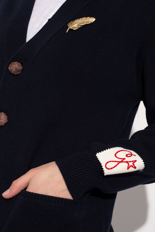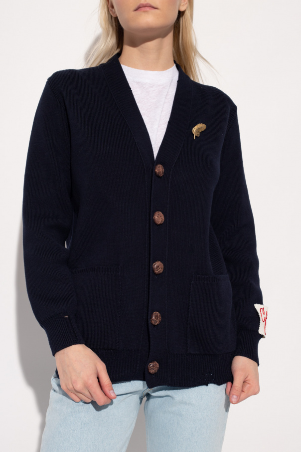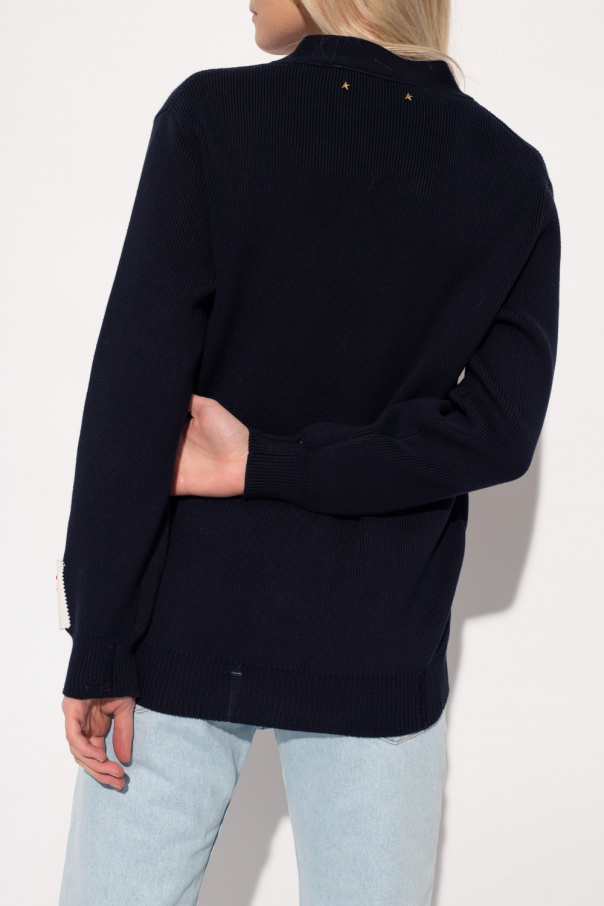 Navy blue V-neck cardigan from Golden Goose. Crafted from a ribbed cotton knit, this style fastens via buttons and showcases a safety-pin, a patch, a gold-tone logo detail, two slip pockets and elasticized trims on the collar, bottom hem and cuffs.