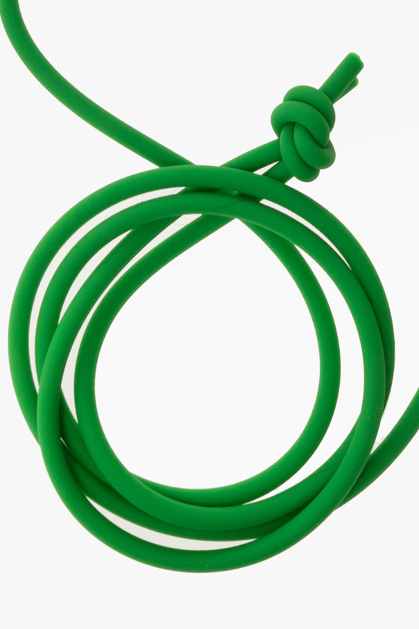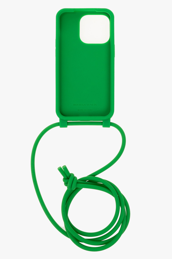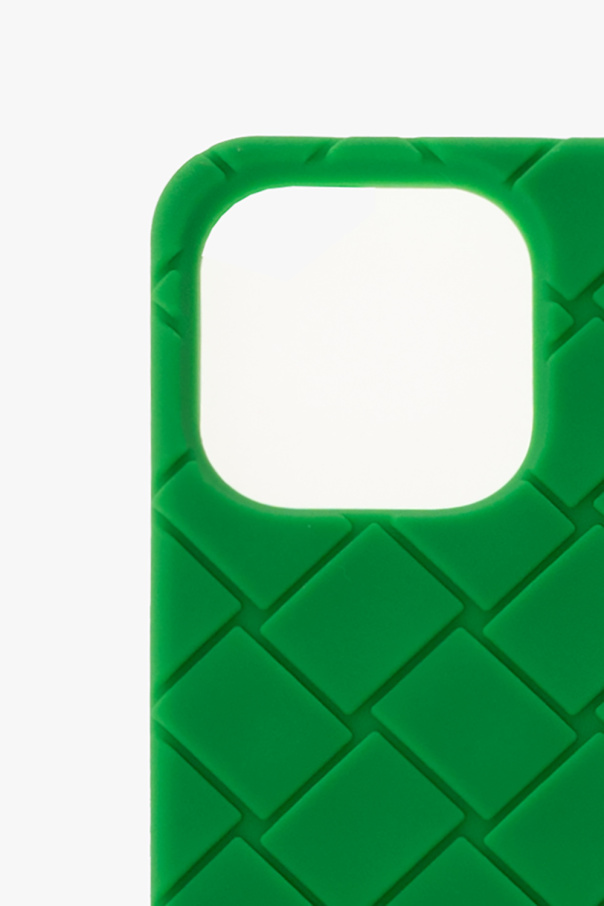 Green iPhone 14 Pro case from Bottega Veneta. Made of silicone, this item comes with a strap and showcases the brand's signature ‘Intreccio’ motif.