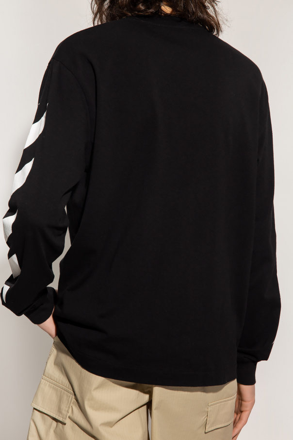 Black crewneck T-shirt from Off-White. Made of cotton, this style features long sleeves, an elasticated collar and a white graphic print with the brand's logo.