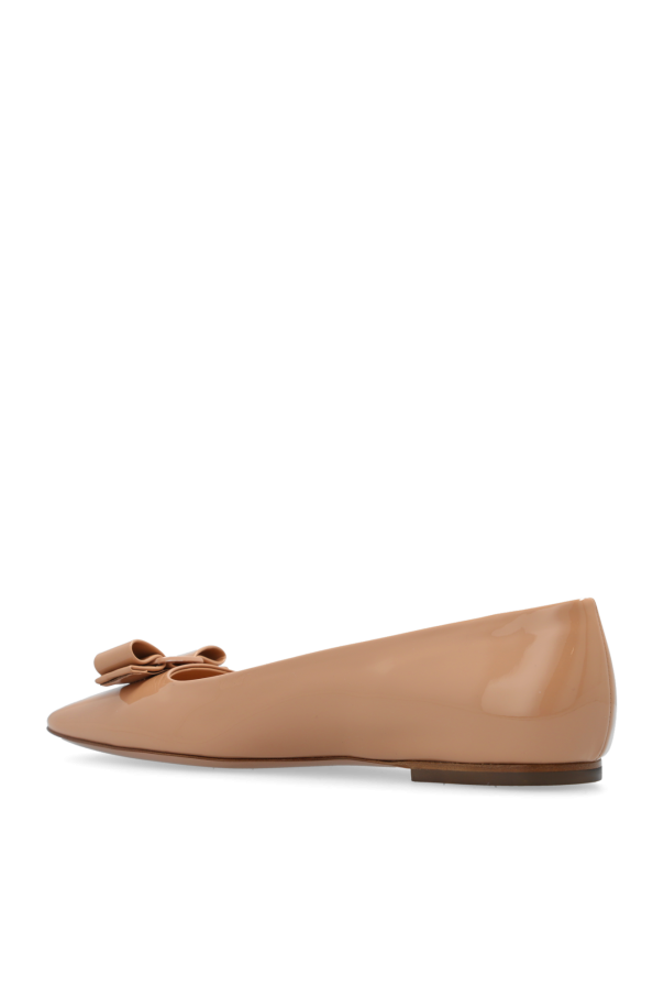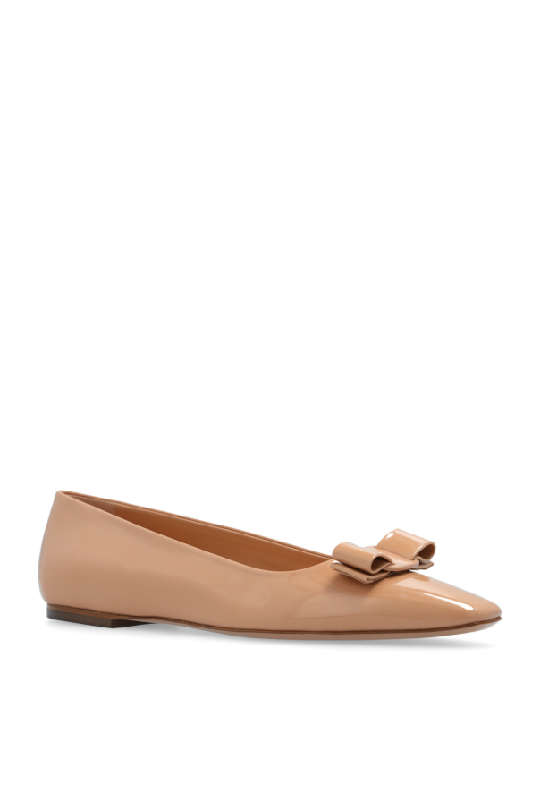 Beige ‘Vara’ ballet flats from FERRAGAMO. Made of patent leather, this design features a bow with a metal appliqué with an engraved logo on the front, tapered, square toe, black leather sole and standard width insole.