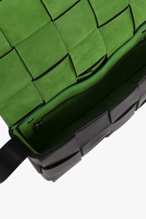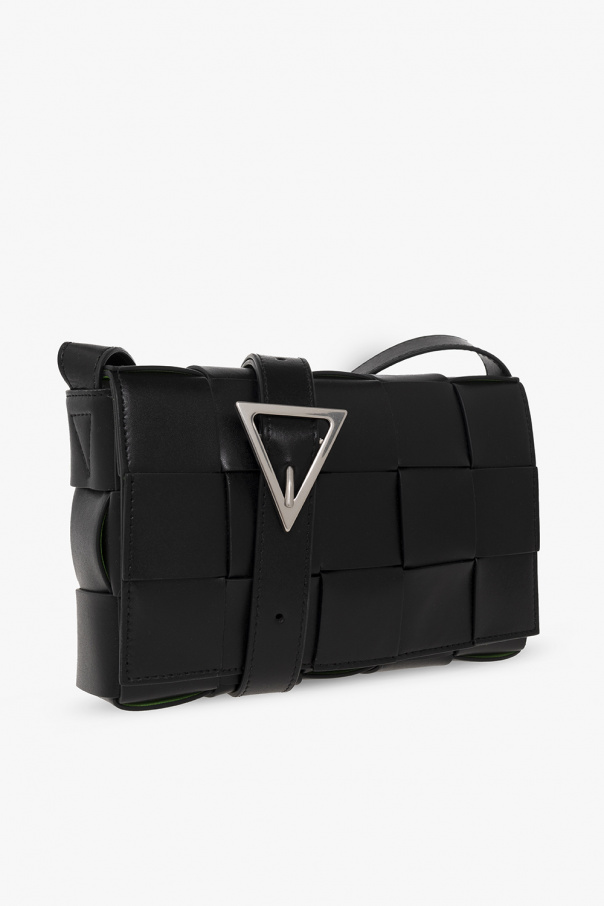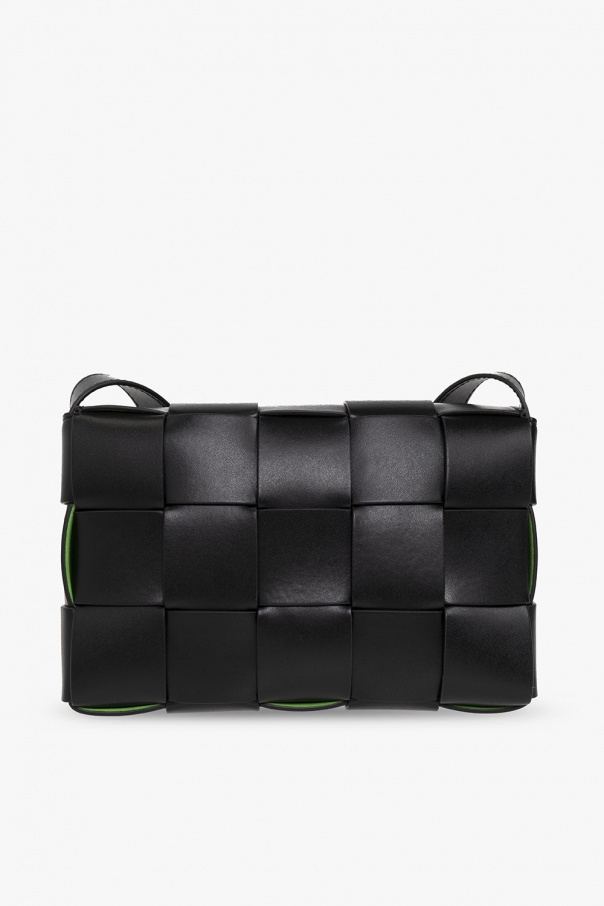 Black ‘Cassette Medium’ shoulder bag from Bottega Veneta. Crafted from calf leather with the brand's iconic Intreccio weave, this design secures with a flap with magnetic fasteners and features an adjustable shoulder strap accentuated with a triangular metal buckle, silver-tone metal hardware and a green suede-clad interior with one zip pocket.