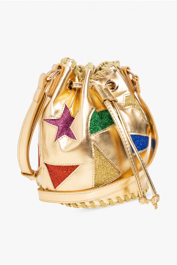 Gold-tone bucket shoulder bag from Stella McCartney Kids. Crafted from faux leather, this design cinches closed with drawstrings and showcases colourful inserts spruced up with glitter, an adjustable strap, gold-tone metal elements and one internal compartment.