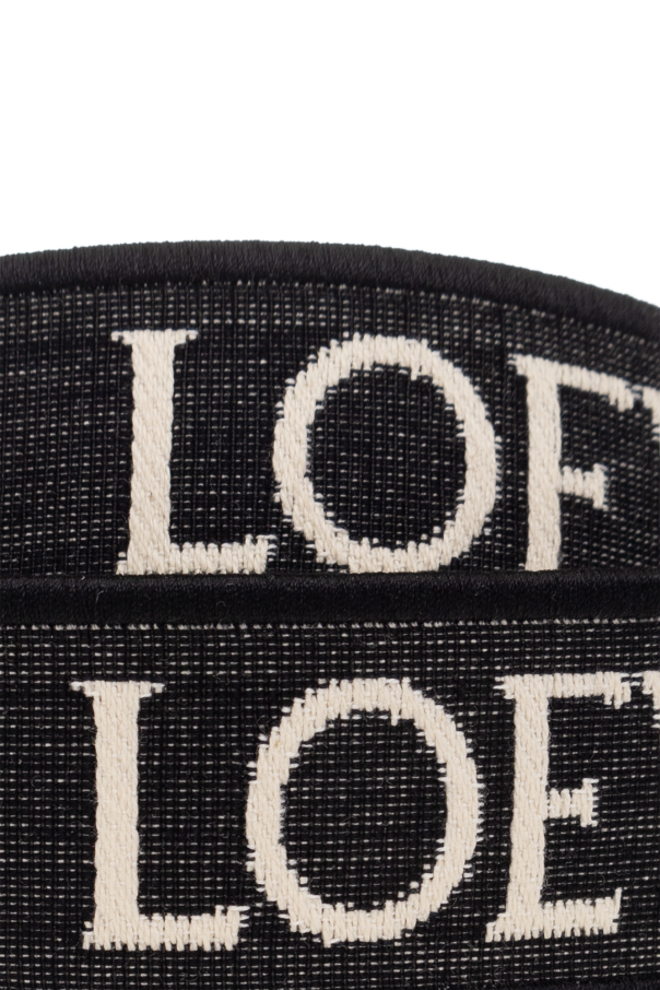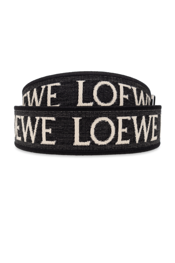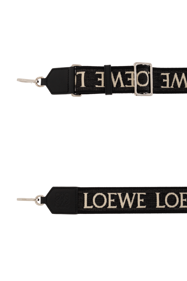Black and white bag strap from Loewe. Made of leather and fabric, this item features a logo pattern and silver-tone carabiner clips.