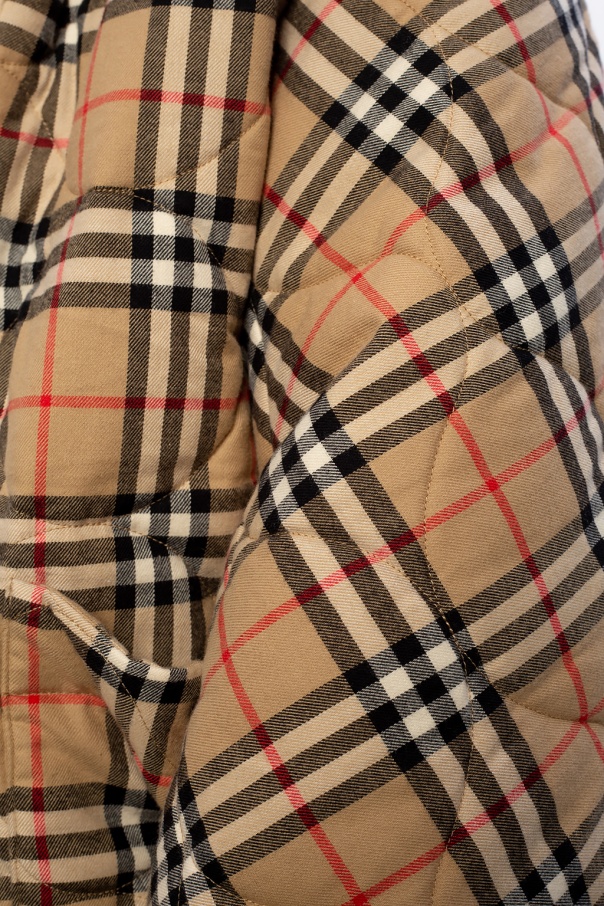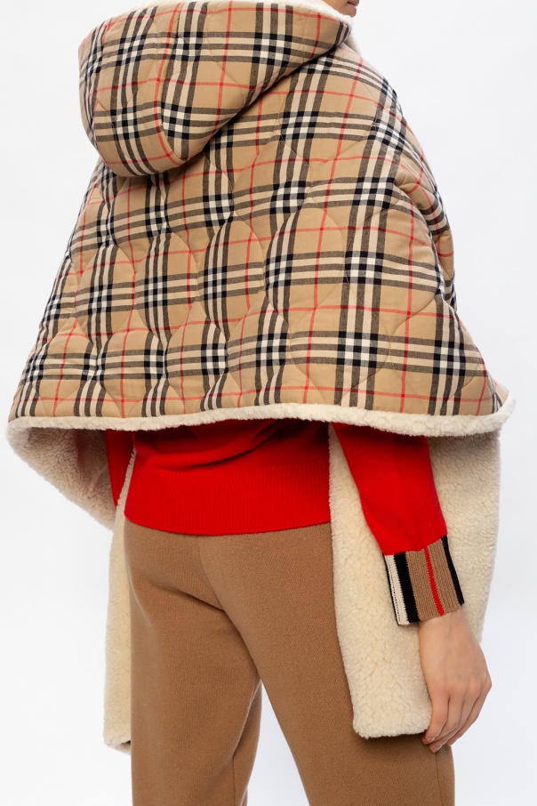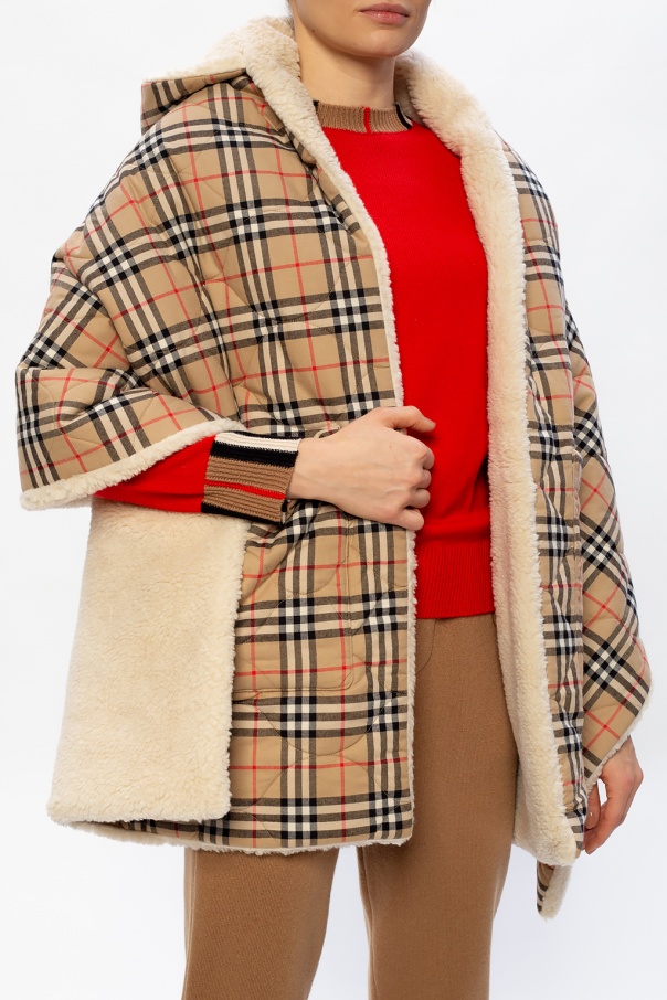 Cream and beige reversible hooded poncho from Burberry. Made of cotton, this design features a front slip pocket and a check pattern in black, cream and red. The reverse side is trimmed with wool.