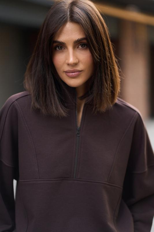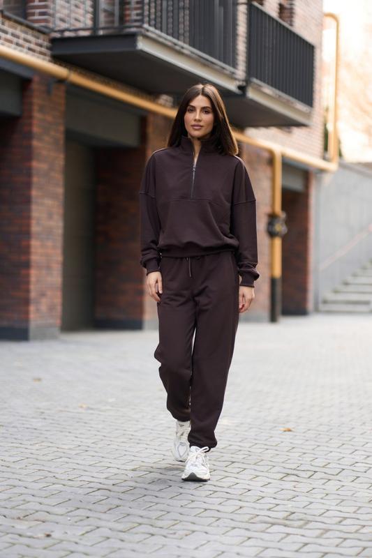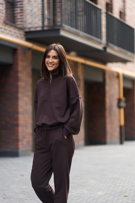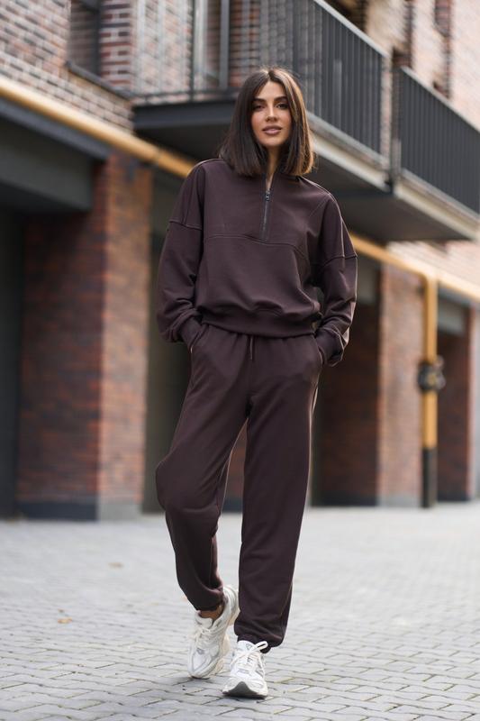 Світшот вільного крою, комір стойка на блискавці в тон костюму,по переду доповнено швами, манжети з рібани, по низу кофти також йде рібана