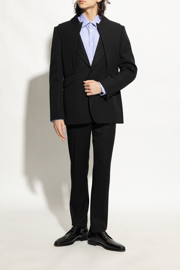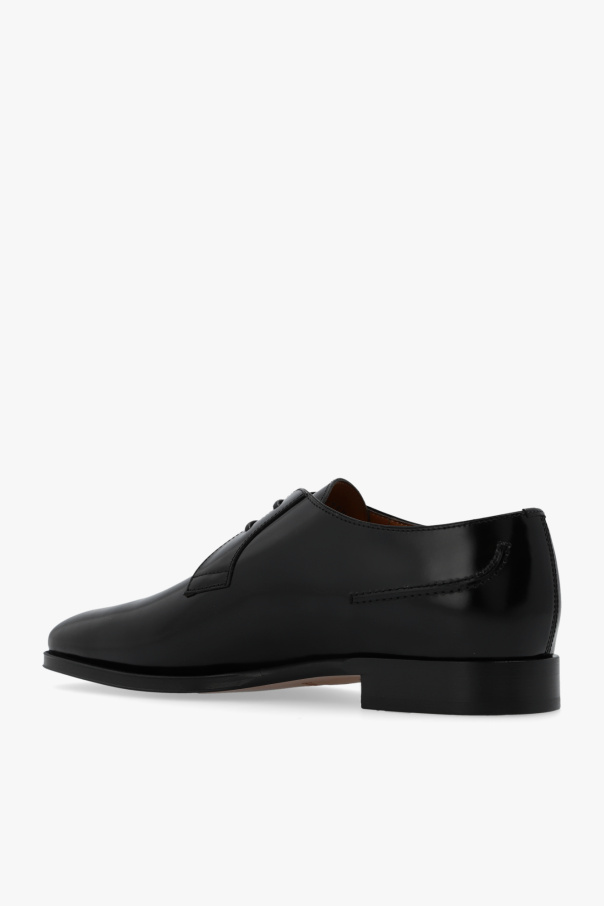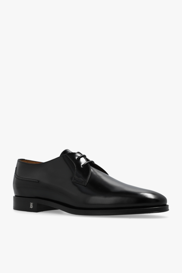 Black ‘Simon’ derby shoes from Burberry. Made of polished leather, this lace-up pair features a silver-tone metal logo detail on the side, almond toe and brown leather sole.
