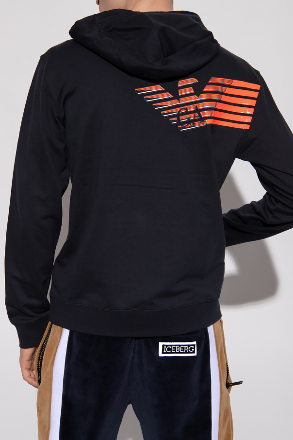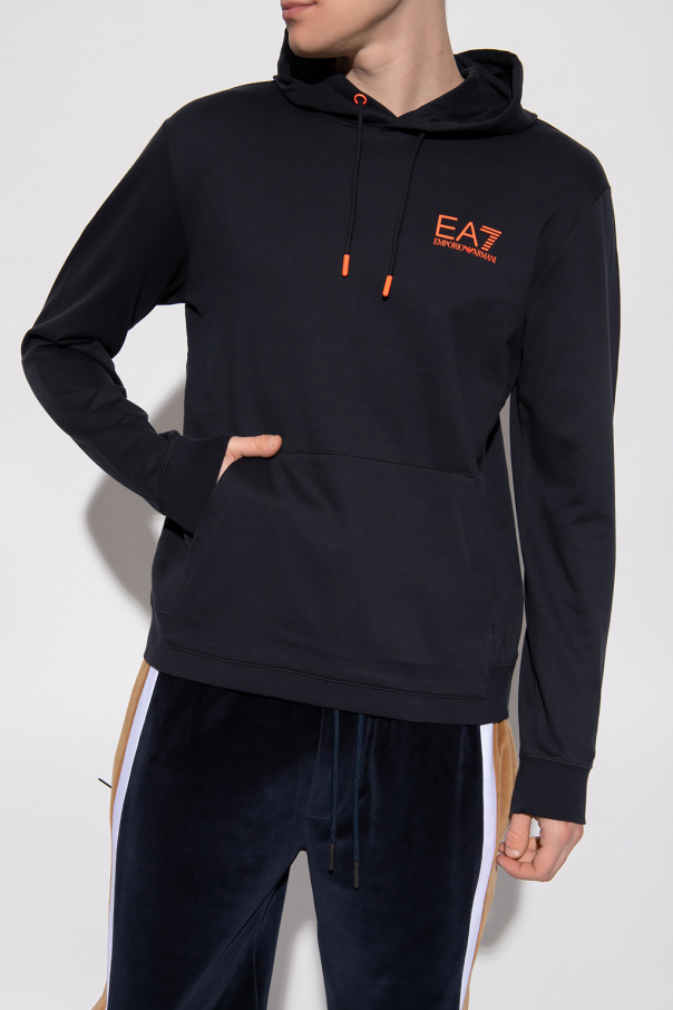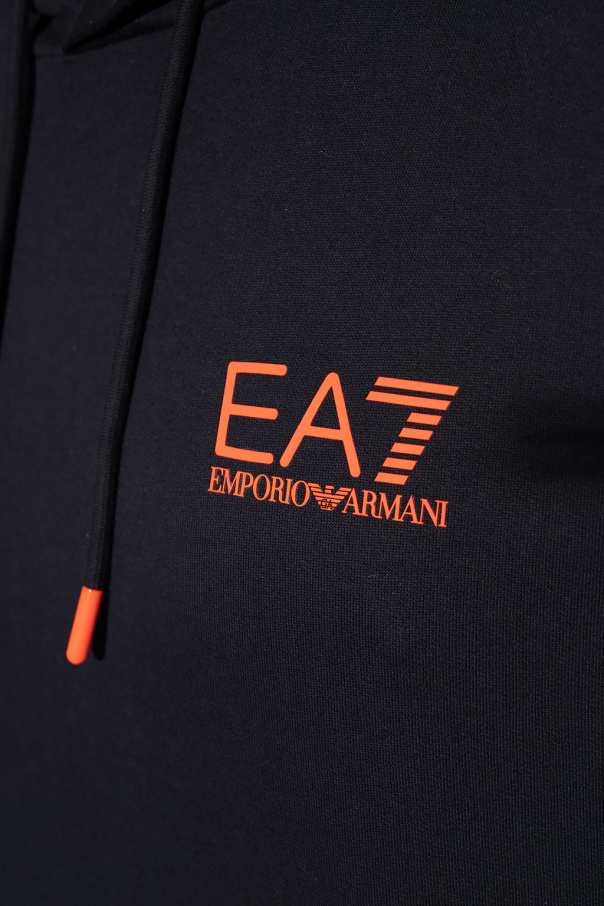 Black sweatshirt with a drawcord-adjustable hood from EA7 Emporio Armani. Crafted from cotton, this hoodie features a red, silver-tone and black graphic print with the brand's logo, a kangaroo pocket and elasticized trims on the bottom hem and cuffs.