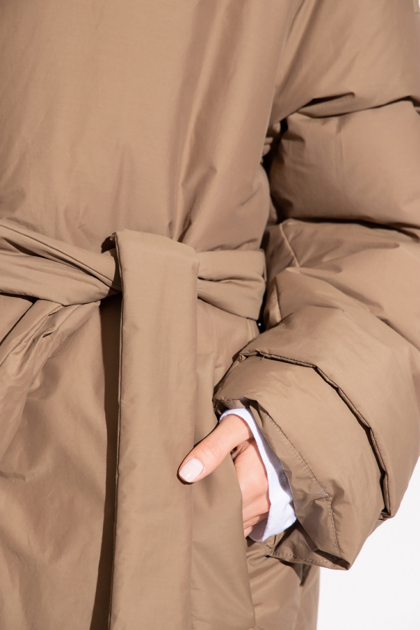 Brown jacket from Stella McCartney. Crafted in part from organic cotton and recycled material, this style features snap fastenings, a waist-cinching belt, a rubber logo patch on the shoulder, two slip pockets, a detachable collar in cream faux fur and long sleeves with buttoned strap adjusters.