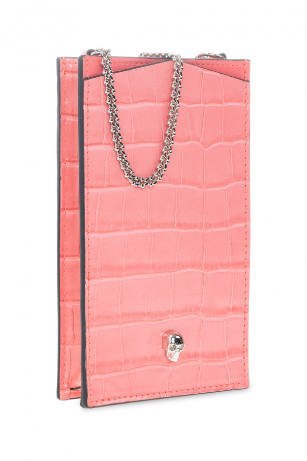 Pink phone pouch from Alexander McQueen. Crafted from calf leather, this model features a front pocket with the iconic skull, three slip pockets and embossed logo at the back, chain shoulder strap and one internal compartment.