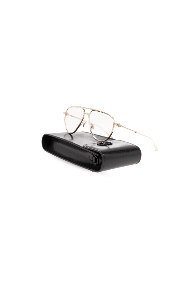 Introducing the exquisite 'V-STUD II' corrective glasses from the renowned Valentino Eyewear collection. Crafted with meticulous attention to detail, these glasses feature a delicate, gold metal frame that epitomizes the essence of elegance and sophistication. The classic aviator silhouette is reimagined with modern clarity through transparent lenses, making them a perfect blend of form and function. The slender arms of the glasses are adorned with subtle details, hinting at the designer's signature without overt branding, offering an air of exclusivity and luxury. When worn, the 'V-STUD II' glasses boast a generous yet refined size, ensuring a statement-making appearance that complements the face with grace and style. Accompanied by a sleek, black leather case with a secure closure, this accessory set not only enhances the overall value but also promises safekeeping of your precious eyewear. A closer inspection reveals intricate construction details such as the hinges and potential designer marks on the nose bridge and temples, all accentuated in a rich gold hue that captures the light beautifully. Made entirely of titanium, these glasses promise durability and comfort, allowing for a lightweight experience without compromising on strength or aesthetic appeal. Why Purchase the 'V-STUD II' Glasses? Elegance and sophistication in a timeless aviator design. Exclusive detailing suggestive of the Valentino Eyewear brand. Luxurious black leather case for protection and style. Durable and comfortable, thanks to the 100% titanium construction. An embodiment of fashion-forward elegance with every wear.