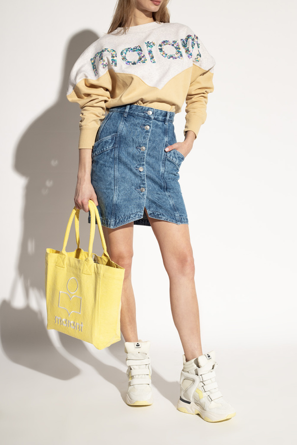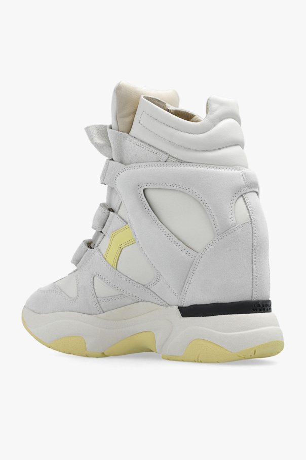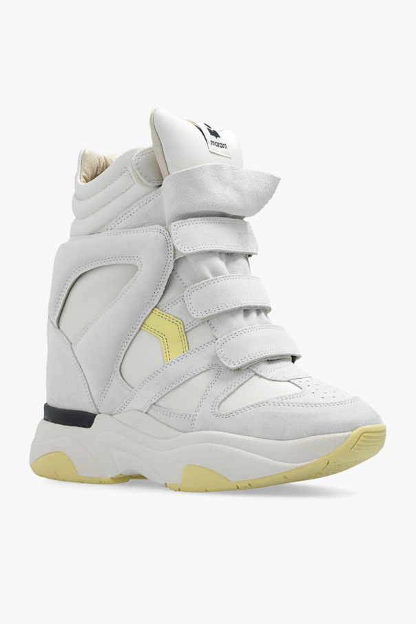 Cream and yellow ‘Balskee’ wedge boots from Isabel Marant. Crafted from suede and leather, this pair features velcro fastening, logo patch on the tongue, perforations on the front and beige rubber sole.