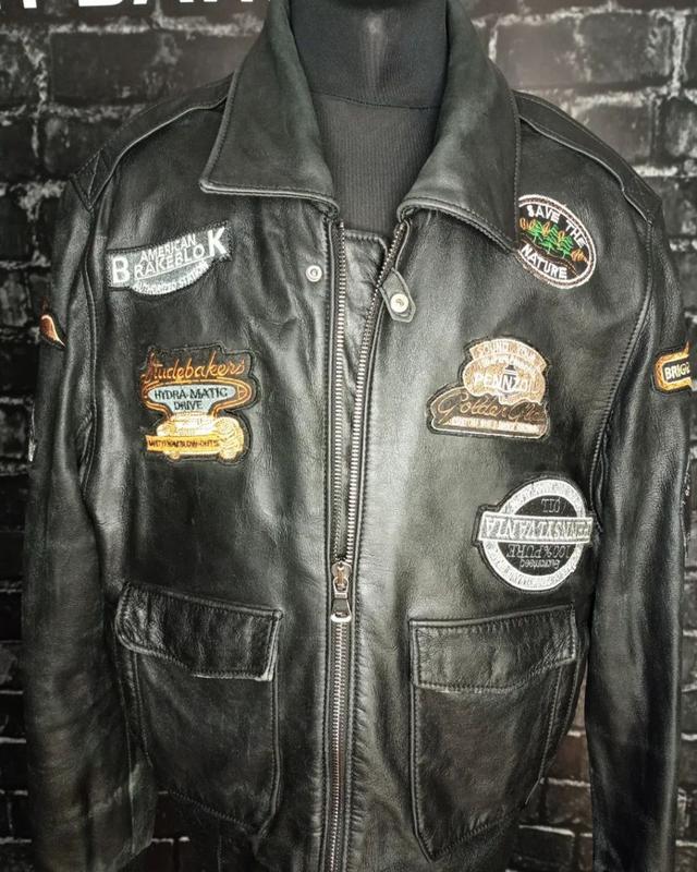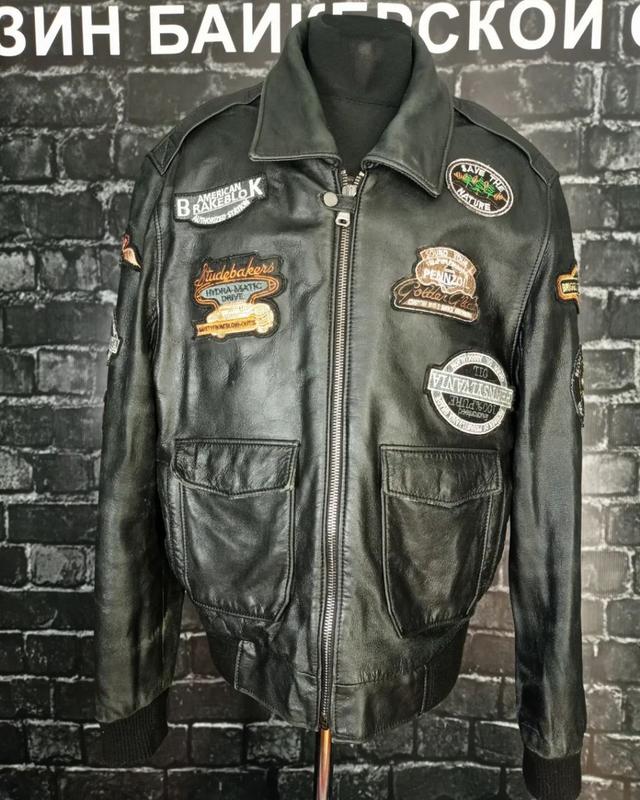 ПИЛОТ КОЖАНЫЙ, PILOT LEATHER, КУРТКА КОЖАНАЯ фирма MIRA made in Italy. Куртка в идеальном состоянии (ЕВРОСТОК МАГАЗИН),стиль классический ПИЛОТ / БОМБЕР укороченный под резинку , манжеты рукавов так же резинка( резинка плотная держит форму в идеальном состоянии). Куртка декорирована байкерскими нашивками в стиле Pilot,пилот. Кожа средней плотности вычинка экстра класса (корова). Цвет насыщенный чёрный. Основная застёжка металлическая массивная молния. Под мышками вставки металлические люверсы( для вентиляции).Подкладка 100% polyester( на подкладке изображены самолёты) Внутри сохранены все внутренние лейблы с указанием состава материалов куртки и указания по уходу за изделием. 3 кармана внутренних ( 1молния,1 на кнопке,1 на липучке) . Size ( размер указан) 54 ,но лучше ориентироваться на замеры. Замерная таблица на последнем фото.